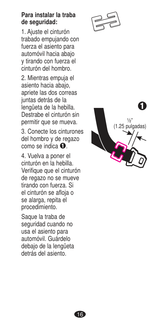 Rear-facing 35 Pull the seat pad off of the front of the child restraint. Route the lap belt through the rear-facing belt path and continue through the opposite opening of the child restraint. Fasten the buckle. IMPORTANT: The crotch buckle must be in the inner slot and the vehicle belt must be located in front of the buckle. Reconnect the seat pad to the front of the child restraint. The vehicle seat belt must be as tight as possible. Using your full weight, push the child restraint firmly into the vehicle seat as you tighten the vehicle seat belt, as shown. DO NOT use lock-off with lap belt only installation. Check your work. Make certain the belt is tight and locked. If you can move the child restraint more than 2.5 cm (1 in.) side to side or front to back at the rear-facing belt path, the vehicle belt is not tight enough. Recheck level line (pg. 32). If you have not tightly secured the child restraint, try again, move it to another location, or install with the lower anchor connector assembly (pg. 28). To remove seat, unbuckle vehicle seat belt.