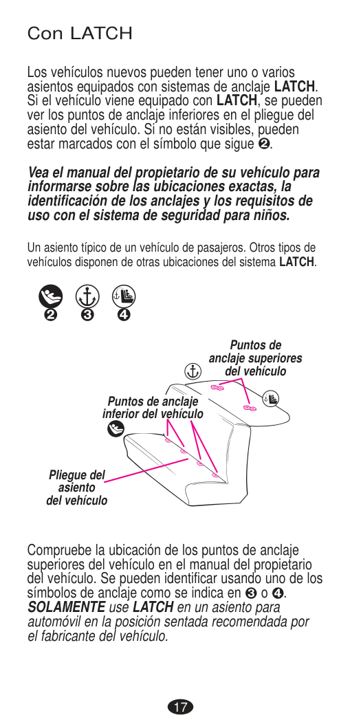 DEATH or SERIOUS INJURY can occur. Seat Belt Warnings15 LATCH/UAS Warnings What is LATCH? LATCH is an acronym for (Lower Anchors and Tethers for CHildren) and refers to a pair of fixed Lower Anchors (or bars) and a Top Tether anchor that are built into your vehicle, in vehicles built after September 1, 2002. The lower LATCH anchors are located in the crease, or bight, between the vehicle seat back and seat cushion, and if not visible, will typically be indicated by the symbol. Top tether anchors are located in various places behind the rear vehicle seat. Center installation in a non-standard LATCH position: Center installation of this child restraint is permitted using inner Lower Anchor Bars from the outside seating positions if: