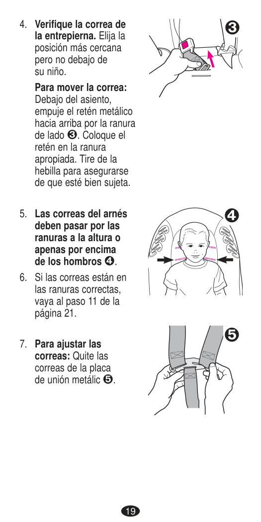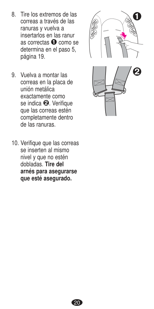 64 Reattaching Booster Back To check installation of booster back: Pull up on base to check that it is securely attached. Ensure hooks are fully engaged over bar at back of seat. IMPORTANT: You MUST ensure that the hooks are fully engaged around the bar before using seat. Harness straps A, crotch buckle B, and harness adjuster strap C are not twisted and are not trapped between Base and Seat Back.
