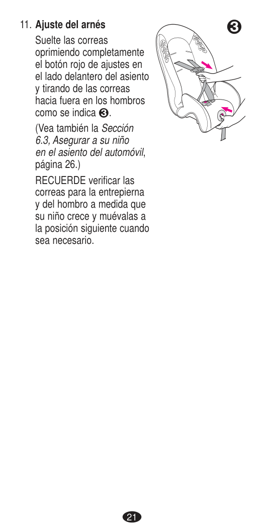 General 65 To adjust, squeeze the headrest adjustment handle while sliding the headrest up or down to the desired position. When the headrest is in one of the locking positions, the adjustment handle will lock into its original position. Pull up and down on the headrest to ensure it is locked into position. NOTE: You may need to loosen the harness straps (pg. 56) to adjust the headrest. Rear-facing: Start with the headrest in its lowest position. Adjust headrest so the harness straps are at or just below the child’s shoulders. Forward-facing: Start with the headrest in its highest position. Adjust headrest so the harness straps are at or just above the child’s shoulders. NOTE: If using the lower Headrest/Harness positions, make sure to tuck the excess Headrest Flap up behind the Headrest Pad. The Headrest Flap is designed with two fold lines to allow for partial A or full storage B behind the Headrest Pad. Handle Adjusting the Headrest/Harness Position Handle