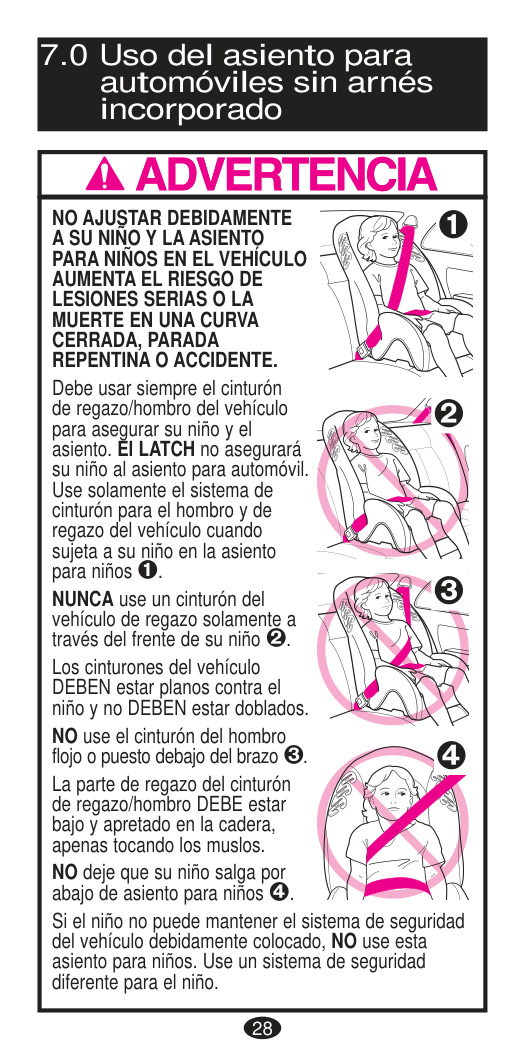28 ALWAYS store the tether strap (pg. 71). Never use tether strap when child restraint seat is rear-facing.