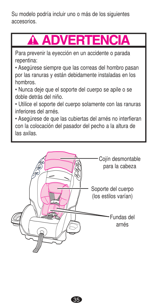 DEATH or SERIOUS INJURY can occur. Child Restraint Features23 Head Pillow (styles may vary) The optional Body Pillow is for REAR-FACING use only and, when placed in the restraint as shown, helps support your child. When using the lower headrest/ harness positions, make sure the bottom of the headrest flap is behind the body pillow flap as shown. Child Restraint Features Body Pillow The optional head pillow is for REAR-FACING use only. The head pillow helps support your child's head. Your head pillow may be one of two different styles. To install: IMPORTANT: Infants may have difficulty breathing when in an upright seated position. Using additional padding or pillows other than the Head Pillow behind the infant’s head or failing to properly recline the child restraint could increase the child’s risk of serious injury or death. Important Slide head pillow into sleeve on headrest as shown. Insert tabs on head pillow into slots on headrest and attach hook-and-loop fasteners to back of headrest.
