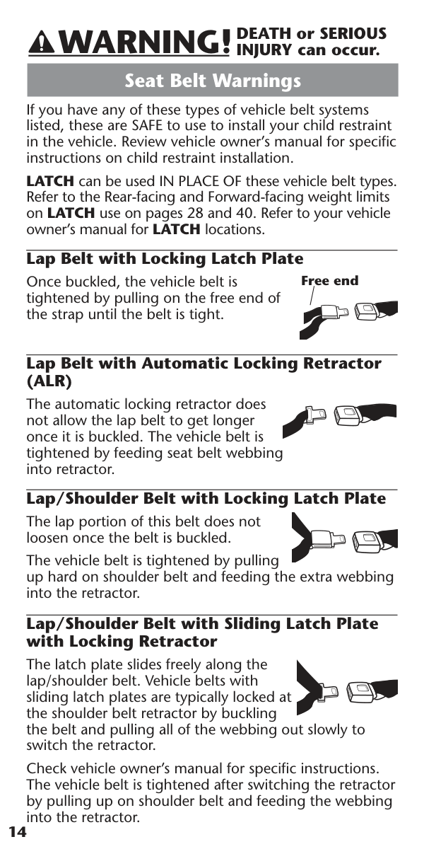 DEATH or SERIOUS INJURY can occur. Seat Belt Warnings Important14 If you have any of these types of vehicle belt systems listed, these are SAFE to use to install your child restraint in the vehicle. Review vehicle owner’s manual for specific instructions on child restraint installation. LATCH/UAS can be used IN PLACE OF these vehicle belt types. Refer to the Rear-facing and Forward-facing weight limits on LATCH/UAS use on pages 28 and 40. Refer to your vehicle owner’s manual for LATCH/UAS locations. Lap Belt with Locking Latch Plate Once buckled, the vehicle belt is tightened by pulling on the free end of the strap until the belt is tight. Lap Belt with Automatic Locking Retractor