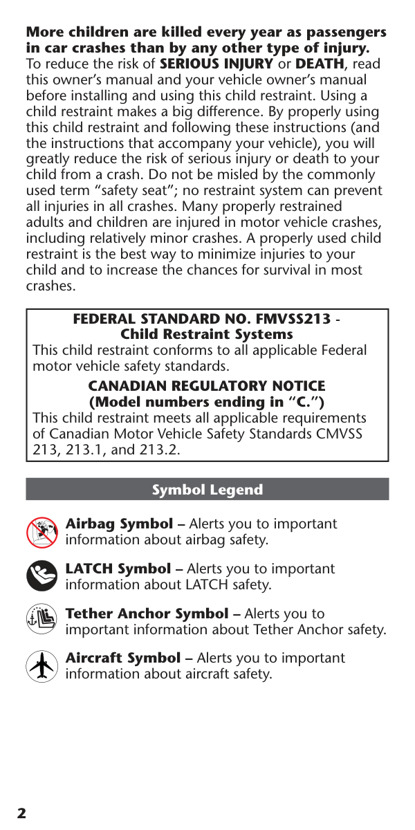 Child Restraint Systems This child restraint conforms to all applicable Federal motor vehicle safety standards.Canadian Regulatory Notice