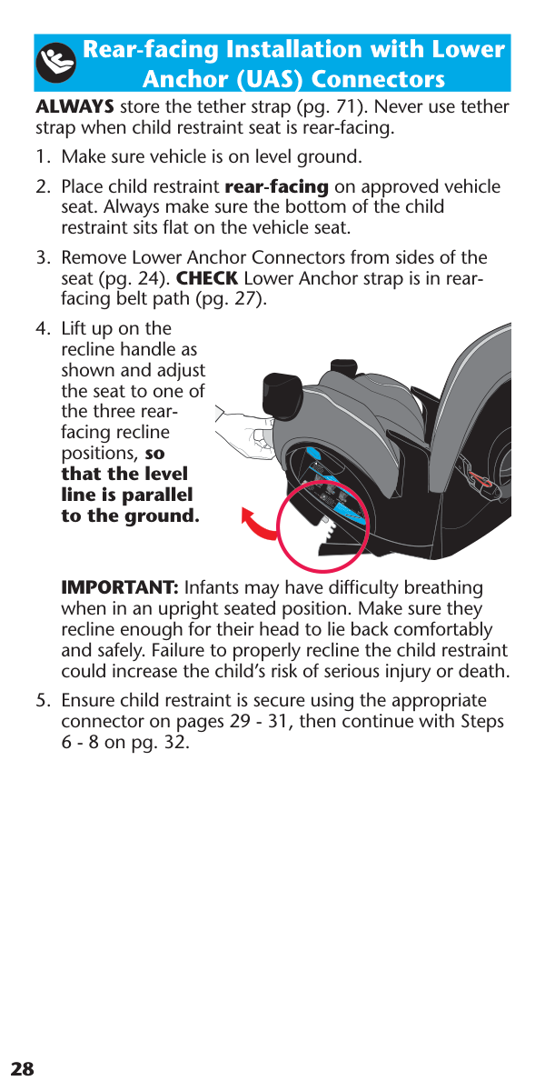 25809488 Rear-facing lower anchor (UAS) storage Rear-facing Installation with Vehicle Seat Belts34 IMPORTANT: Infants may have difficulty breathing when in an upright seated position. Make sure they recline enough for their head to lie back comfortably and safely. Failure to properly recline the child restraint could increase the child’s risk of serious injury or death. NOTE: In some vehicles, it may be necessary to place a tightly rolled towel or small blanket beneath the front edge of the child restraint to provide enough recline so that the level line is parallel to the ground. For additional troubleshooting, see pg. 75.