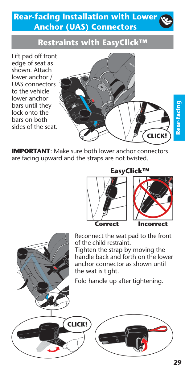 Restraints with EasyClick Rear-facing Installation with Lower Anchor (UAS) Connectors Reconnect the seat pad to the front of the child restraint. Tighten the strap by moving the handle back and forth on the lower anchor connector as shown until the seat is tight. Fold handle up after tightening. Correct Incorrect EasyClick30 Install the LATCH/UAS Guides (Optional)* NEVER use if parts are broken or damaged. NEVER use LATCH/UAS Guides if they interfere in any way with installation. Connect one guide, if provided, to each lower anchor by sliding the guide into the vehicle seat crease and under the lower anchor. Install the Quick Connectors Lift pad off front edge of seat. Attach lower anchor/UAS connectors to the vehicle lower anchor bars until they lock onto the bars on both sides of the seat. Reconnect the seat pad to the front of the child restraint. Using your full weight, push the child restraint firmly into the vehicle seat while pulling up on the Lower Anchor Strap to tighten, as shown. IMPORTANT: Make sure both lower anchor connectors are facing upward and the straps are not twisted.