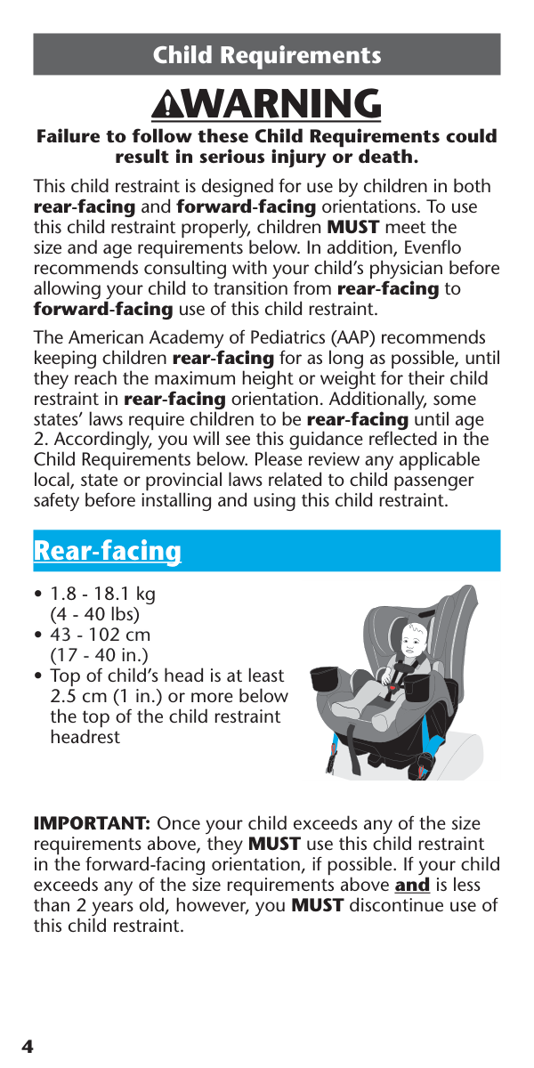 4 This child restraint is designed for use by children in both rear-facing and forward-facing orientations. To use this child restraint properly, children MUST meet the size and age requirements below. In addition, Evenflo recommends consulting with your child’s physician before allowing your child to transition from rear-facing to forward-facing use of this child restraint. The American Academy of Pediatrics (AAP) recommends keeping children rear-facing for as long as possible, until they reach the maximum height or weight for their Car Seat in rear-facing orientation.* Additionally, some states’ laws require children to be rear-facing until age 2. Accordingly, you will see this guidance reflected in the Child Requirements on the following pages. Please review any applicable local, state or provincial laws related to child passenger safety before installing and using this Car Seat. *Pediatrics. 2018;142(4):e20182460 Rear-facing