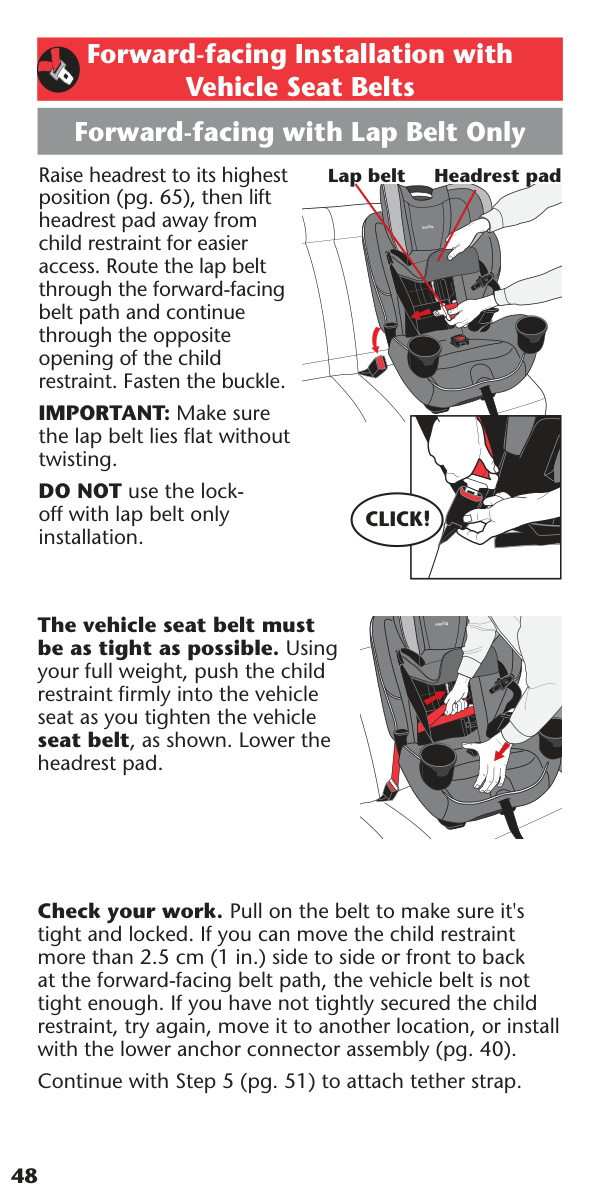 Forward-facing Installation with Vehicle Seat Belts48 The vehicle seat belt must be as tight as possible. Using your full weight, push the child restraint firmly into the vehicle seat as you tighten the vehicle seat belt, as shown. Lower the headrest pad. Raise headrest to its highest position (pg. 59), then lift headrest pad away from child restraint for easier access. Route the lap belt through the forward-facing belt path and continue through the opposite opening of the child restraint. Fasten the buckle. IMPORTANT: Make sure the lap belt lies flat without twisting. DO NOT use the belt guide with lap belt only installation.