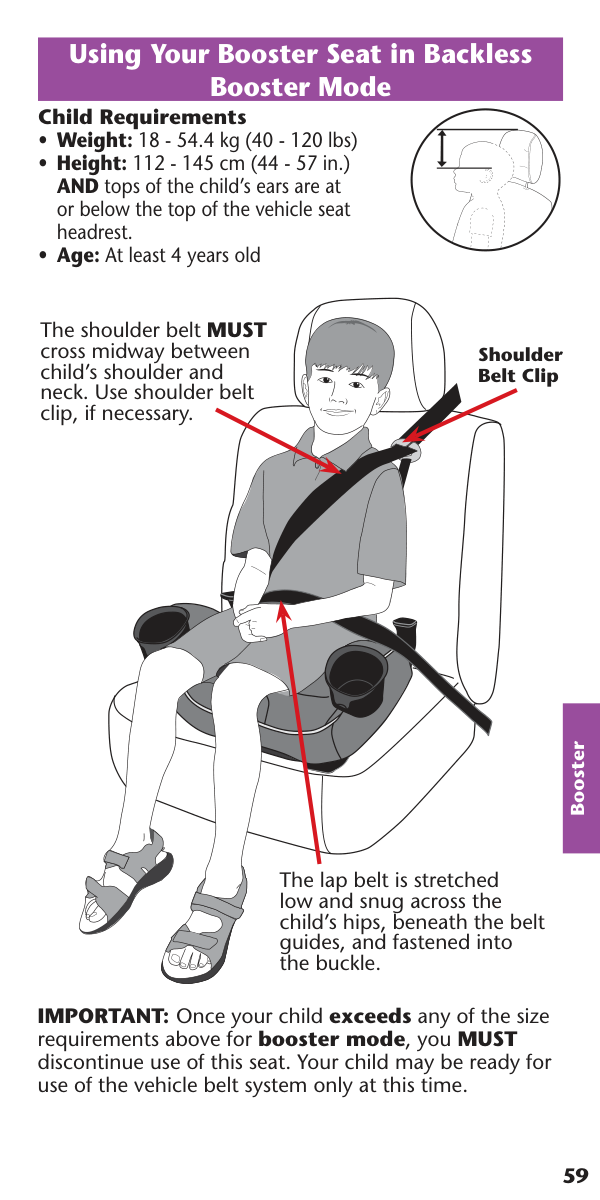 In booster mode, the child must weigh 18–54.4 kg (40–120 lbs), be 112–145 cm (44–57 in.) tall, have the tops of their ears at or below the top of the headrest, and be at least 4 years old. Once the child exceeds any of these requirements, you must discontinue use of the seat entirely. (Page 55)