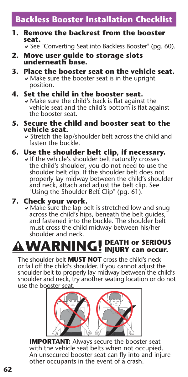 DEATH or SERIOUS INJURY can occur. Location Warnings• Vehicle Types In Which The Restraint