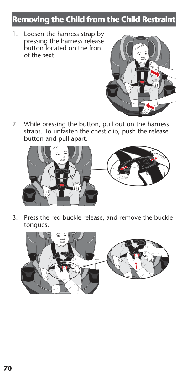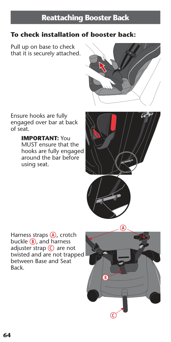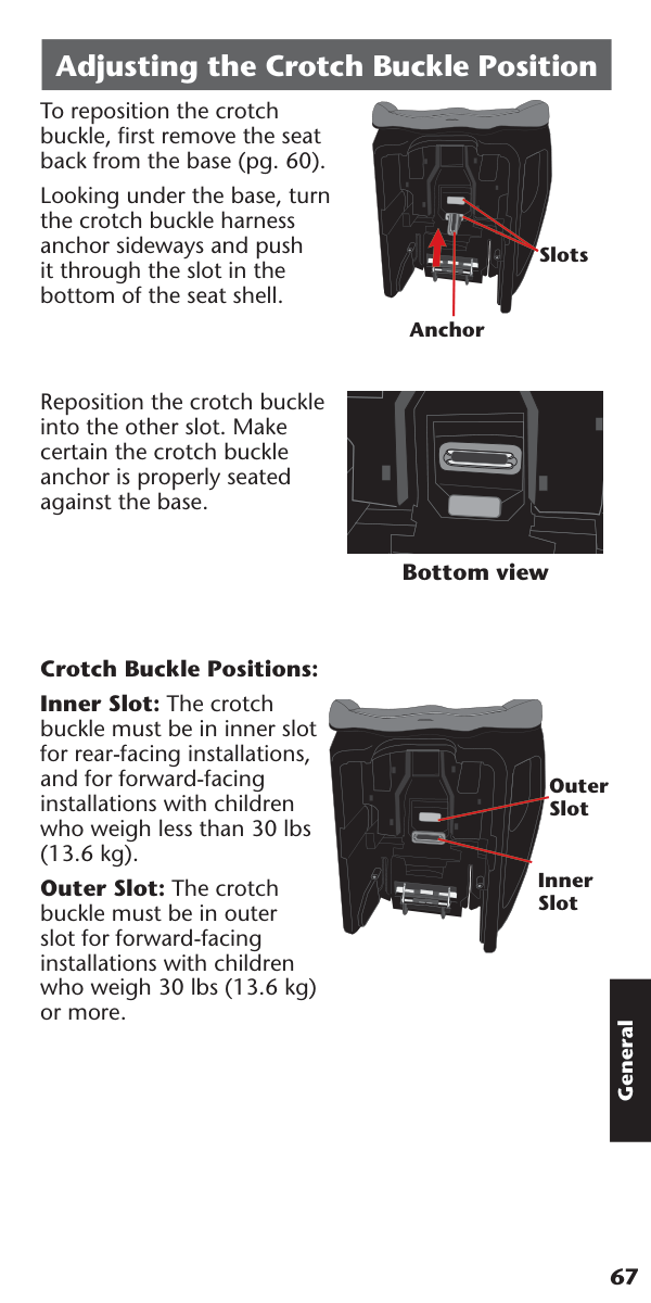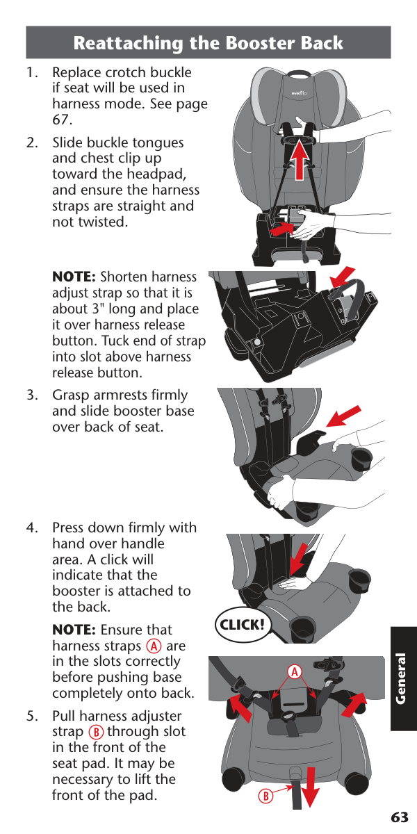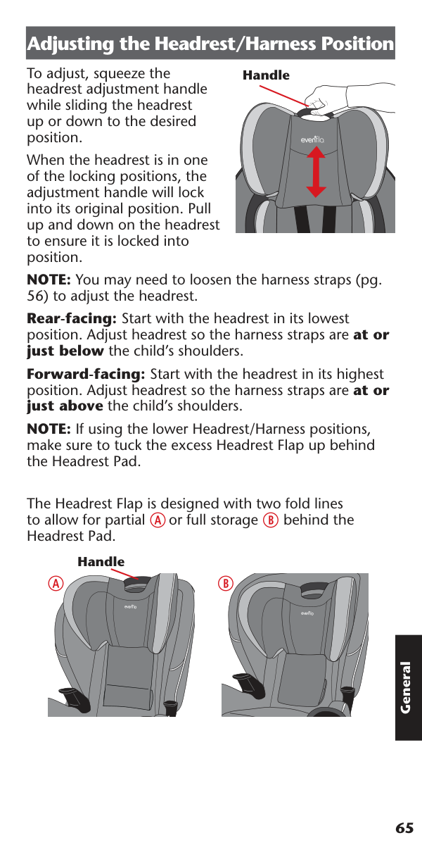 DEATH or SERIOUS INJURY can occur.General 59 To adjust, squeeze the headrest adjustment handle while sliding the headrest up or down to the desired position. When the headrest is in one of the locking positions, the adjustment handle will lock into its original position. Pull up and down on the headrest to ensure it is locked into position. NOTE: You may need to loosen the harness straps (pg. 56) to adjust the headrest. Rear-facing: Start with the headrest in its lowest position. Adjust headrest so the harness straps are at or just below the child’s shoulders. Forward-facing: Start with the headrest in its highest position. Adjust headrest so the harness straps are at or just above the child’s shoulders. NOTE: If using the lower Headrest/Harness positions, make sure to tuck the excess Headrest Flap up behind the Headrest Pad. The Headrest Flap is designed with two fold lines to allow for partial A or full storage B behind the Headrest Pad. Handle Adjusting the Headrest/Harness Position Handle