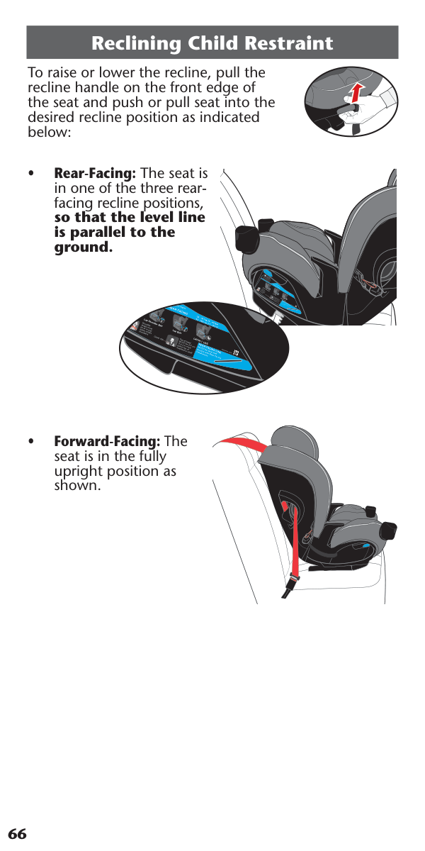 60 To raise or lower the recline, pull the recline handle on the front edge of the seat and push or pull seat into the desired recline position as indicated below: • Rear-Facing: The seat is in one of the three rear- facing recline positions, so that the level line is parallel to the ground. • Forward-Facing: The seat is in the fully upright position as shown. Reclining Child Restraint Shoulder straps must be at or just below child’s shoulders Route shoulder belt only through lock off. See user manual for additional information.