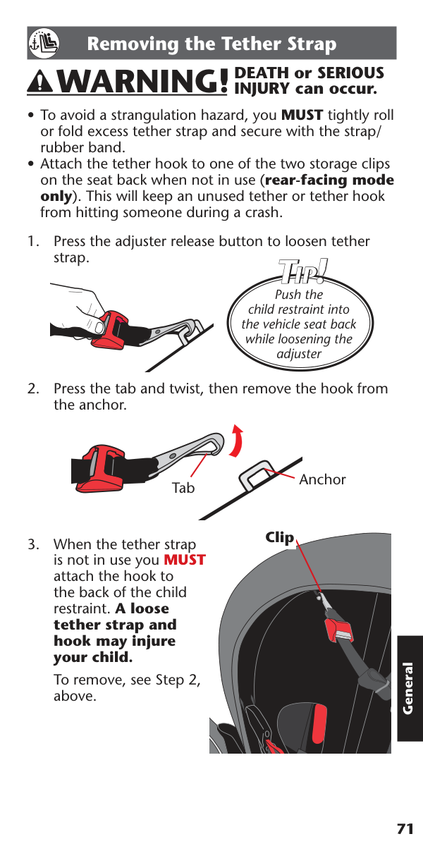 DEATH or SERIOUS INJURY can occur. LATCH/UAS Warnings17 Tether Strap Warnings To avoid a strangulation hazard, you MUST tightly roll or fold excess of unused tether strap and secure with a rubber band. Attach the tether hook to the storage clip when not in use. (See "Removing the Tether Strap" on pg. 64). This will keep an unused tether or tether hook from hitting someone during a crash.
