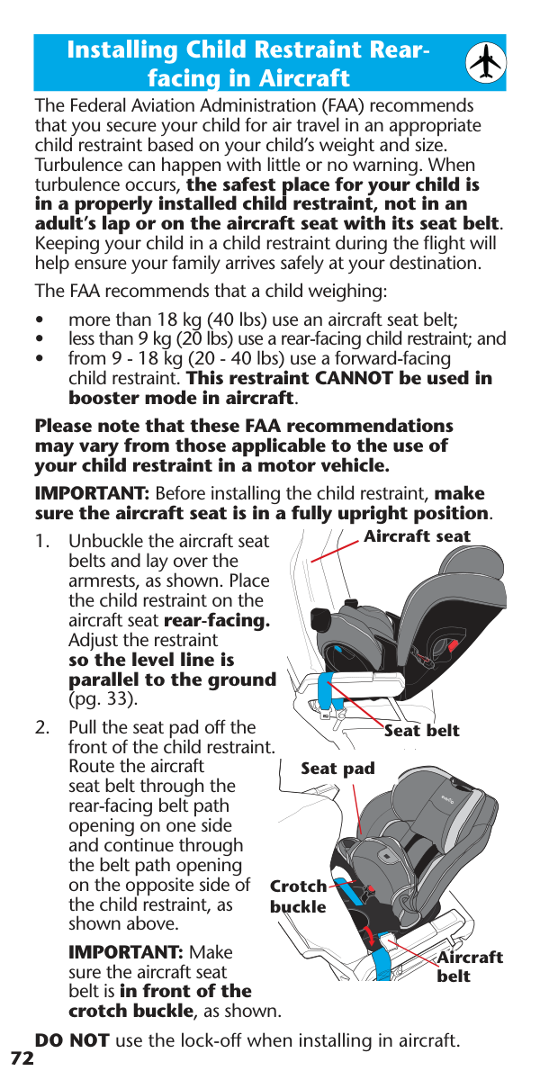 DEATH or SERIOUS INJURY can occur. Push the child restraint into the vehicle seat back while loosening the adjuster. Tip! Tip! Tip!General 65 Installing Child Restraint in Aircraft The Federal Aviation Administration (FAA) recommends that you secure your child for air travel in an appropriate child restraint based on your child’s weight and size. Turbulence can happen with little or no warning. When turbulence occurs, the safest place for your child is in a properly installed child restraint, not in an adult’s lap or on the aircraft seat with its seat belt. Keeping your child in a child restraint during the flight will help ensure your family arrives safely at your destination. The FAA recommends that a child weighing: • more than 18 kg (40 lbs) use an aircraft seat belt; • less than 9 kg (20 lbs) use a rear-facing child restraint; and • from 9 - 18 kg (20 - 40 lbs) use a forward-facing child restraint. This restraint CANNOT be used in booster mode in aircraft. Please note that these FAA recommendations may vary from those applicable to the use of your child restraint in a motor vehicle. NOTE: For Rear-Facing Aircraft Installation, see pgs. 66-67. For Forward-Facing Aircraft Installation, see pgs. 68-69.