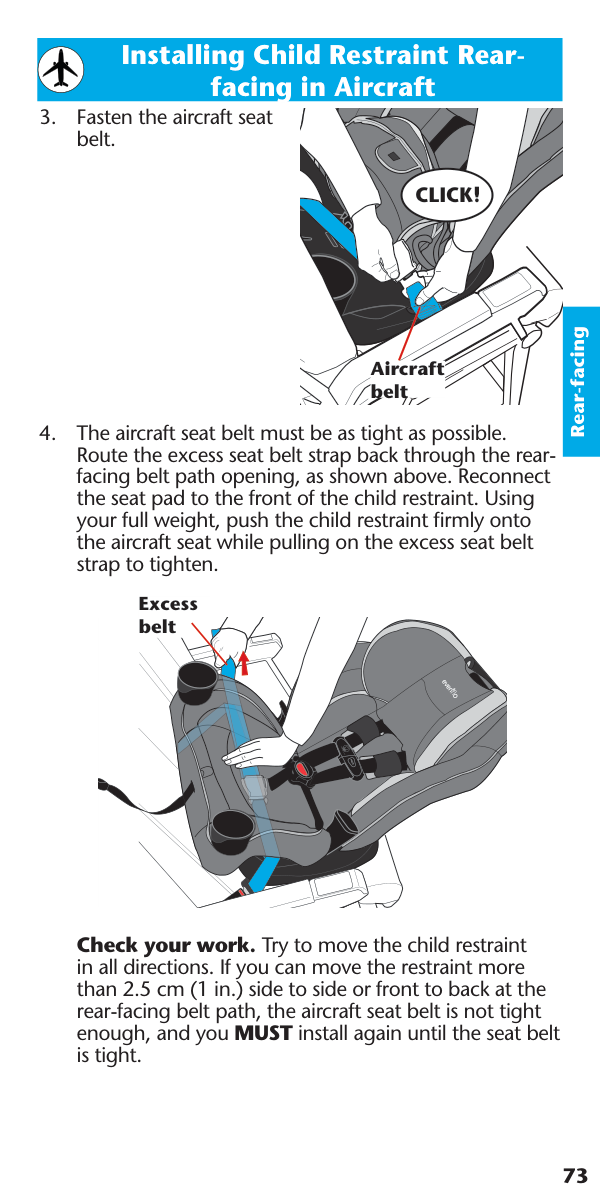 Excess belt Installing Child Restraint Rear-facing in Aircraft68 IMPORTANT: Before installing the child restraint, make sure the aircraft seat is in a fully upright position.