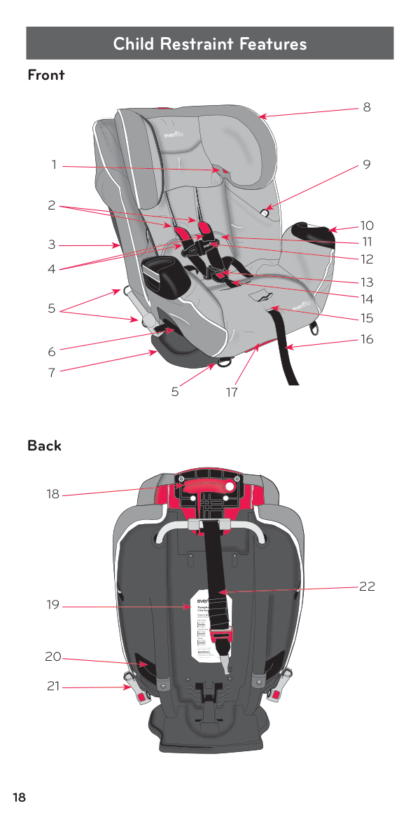 To reduce the risk of serious injury or death, read this owner’s manual prior to installing and using this child restraint. © 20XX Evenflo Company, Inc. 2.3 to 18 kg (5 to 40 lbs) 48 to 102 cm (19 to 40 in.) Rear-facing 10 to 29.4 kg (22 to 65 lbs) 71 to 127 cm (28 to 50 in.) Forward-facing 18 to 49.8 kg (40 to 110 lbs) 112 to 145 cm (44 to 57 in.) Booster Back 1 8 9 17 16 2 4 3 5 5 10 11 12 13 6 7 14 15 18 19 20 21 22 Child Restraint Features19 Important