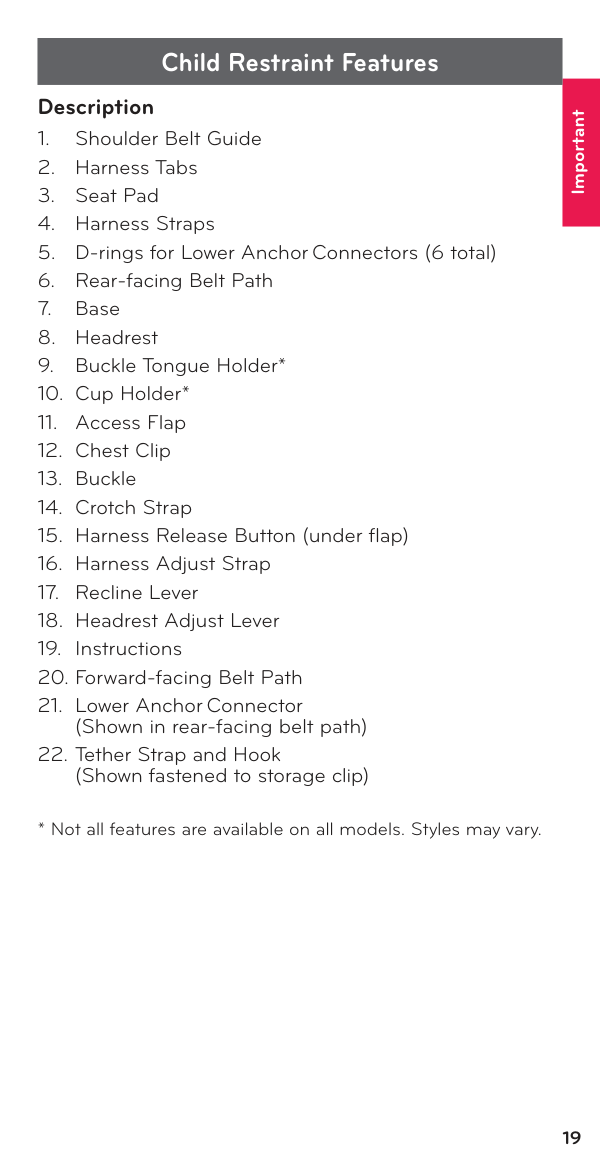 (Model numbers ending in “C”) This child restraint meets all applicable requirements of Canada Motor Vehicle Safety Standards CMVSS 213, 213.1, and 213.2. Symbol Legend Airbag Symbol – Alerts you to important information about airbag safety. LATCH Symbol – Alerts you to important information about LATCH safety. Tether Anchor Symbol – Alerts you to important information about Tether Anchor safety. Aircraft Symbol – Alerts you to important information about aircraft safety. According to the U.S. National Highway Traffic Safety Administration (NHTSA), car seats and boosters provide protection for infants and children in a crash, yet car crashes are a leading cause of death for children. To reduce the risk of SERIOUS INJURY or DEATH, read this owner’s manual and your vehicle owner’s manual before installing and using this Car Seat. Using a Car Seat makes a big difference. By properly using this Car Seat and following these instructions, the instructions on the Car Seat, and the instructions that accompany your vehicle, you will greatly reduce the risk of serious injury or death to your child from a crash. Do not be misled by the commonly used term “safety seat”; no restraint system can prevent all injuries in all crashes. Many properly restrained adults and children are injured in motor vehicle crashes, including relatively minor crashes. A properly used Car Seat is the best way to minimize injuries to your child and to increase the chances for your child’s survival in most crashes.3 Rear-facing Forward-facing Booster General Important Important Information Child Requirements�����������������������������������������������������������������������������������4 Premature Infant Use��������������������������������������������������������������������������������6 Warnings�������������������������������������������������������������������������������������������������������7 Safe Practices��������������������������������������������������������������������������������������������15 Recall Information for U.S. Customers�����������������������������������������������16 Public Notice for Canadian Customers����������������������������������������������16 Motor Vehicle/Aircraft Usage����������������������������������������������������������������17 Child Restraint Features��������������������������������������������������������������������������18 Using the Child Restraint Rear-Facing Child Requirements���������������������������������������������������������������������������������24 Moving Lower Anchor Connectors to the Rear-facing Belt Path�������������������������������������������������������������������������25 Installation with Lower Anchor Connectors���������������������������������������27 Installation with Seat Belts���������������������������������������������������������������������31 Rear-facing Installation Checklist��������������������������������������������������������35 Using the Child Restraint Forward-facing with Harness Child Requirements���������������������������������������������������������������������������������36 Moving Lower Anchor Connectors to the Forward-facing Belt Path�������������������������������������������������������������������37 Installation with Lower Anchor Connectors���������������������������������������39 Installation with Seat Belts���������������������������������������������������������������������45 Forward-facing Installation Checklist��������������������������������������������������50 Using the Child Restraint as a Belt-Positioning Booster Child Req