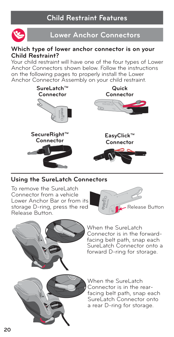20 Child Restraint Features To remove the SureLatch Connector from a vehicle Lower Anchor Bar or from its storage D-ring, press the red Release Button. Release Button Using the SureLatch Connectors Lower Anchor Connectors Which type of lower anchor connector is on your Child Restraint? Your child restraint will have one of the four types of Lower Anchor Connectors shown below. Follow the instructions on the following pages to properly install the Lower Anchor Connector Assembly on your child restraint. SureLatch™ Connector SecureRight™ Connector Quick Connector EasyClick™ Connector When the SureLatch Connector is in the forward- facing belt path, snap each SureLatch Connector onto a forward D-ring for storage. When the SureLatch Connector is in the rear- facing belt path, snap each SureLatch Connector onto a rear D-ring for storage. buckle storage buckle storage