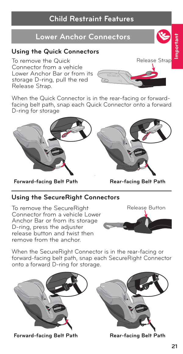 21 buckle storage Child Restraint Features Release Strap To remove the SecureRight Connector from a vehicle Lower Anchor Bar or from its storage D-ring, press the adjuster release button and twist then remove from the anchor. When the SecureRight Connector is in the rear-facing or forward-facing belt path, snap each SecureRight Connector onto a forward D-ring for storage. Release Button Important Using the Quick Connectors Lower Anchor Connectors To remove the Quick Connector from a vehicle Lower Anchor Bar or from its storage D-ring, pull the red Release Strap. When the Quick Connector is in the rear-facing or forward- facing belt path, snap each Quick Connector onto a forward D-ring for storage Using the SecureRight Connectors buckle storage buckle storage buckle storage Forward-facing Belt Path Rear-facing Belt Path Forward-facing Belt Path Rear-facing Belt Path
