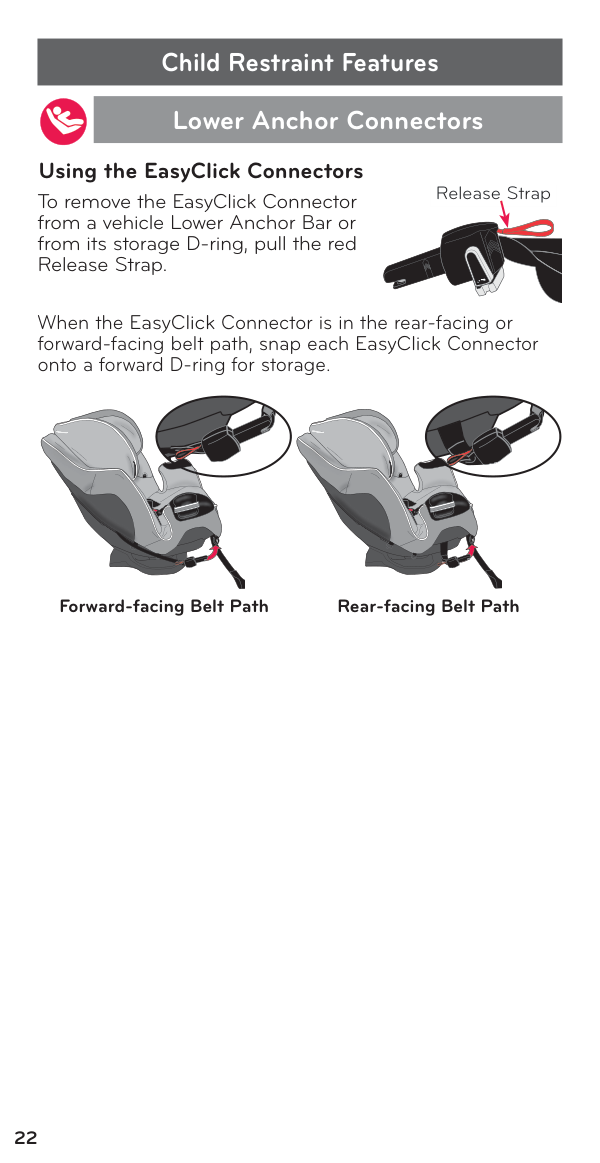 22 Child Restraint Features Lower Anchor Connectors To remove the EasyClick Connector from a vehicle Lower Anchor Bar or from its storage D-ring, pull the red Release Strap. When the EasyClick Connector is in the rear-facing or forward-facing belt path, snap each EasyClick Connector onto a forward D-ring for storage. Release Strap Using the EasyClick Connectors Forward-facing Belt Path Rear-facing Belt Path buckle storage buckle storage