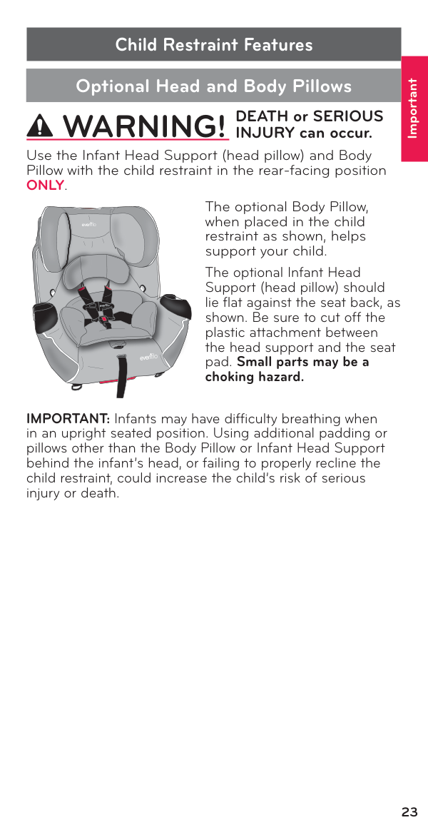 The optional Body Pillow, when placed in the child restraint as shown, helps support your child. The optional Infant Head Support (head pillow) should lie flat against the seat back, as shown. Be sure to cut off the plastic attachment between the head support and the seat pad. Small parts may be a choking hazard. IMPORTANT: Infants may have difficulty breathing when in an upright seated position. Using additional padding or pillows other than the Body Pillow or Infant Head Support behind the infant’s head, or failing to properly recline the child restraint, could increase the child’s risk of serious injury or death.Warning!
