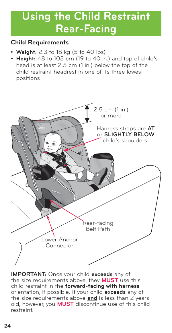 DEATH or SERIOUS INJURY can occur. This Car Seat is designed for use by children in both rear-facing and forward-facing mode, as well as in booster mode. To use this Car Seat properly, children MUST meet the size and age requirements on the following pages. In addition, Evenflo recommends consulting with your child’s physician before allowing your child to transition between modes. The American Academy of Pediatrics (AAP) recommends keeping children rear-facing for as long as possible, until they reach the maximum height or weight for their Car Seat in rear-facing orientation.* Additionally, some states’ laws require children to be rear-facing until age 2. Accordingly, you will see this guidance reflected in the Child Requirements on the following pages. Please review any applicable local, state or provincial laws related to child passenger safety before installing and using this Car Seat. *Pediatrics. 2018;142(4):e201824605 Rear-facing • 2.3 to 18 kg (5 to 40 lbs) • 48 to 102 cm (19 to 40 in.) and top of child’s head is at least 2.5 cm (1 in.) below the top of the child restraint headrest in one of its three lowest positions IMPORTANT: Once your child exceeds any of the size requirements above, they MUST use this child restraint in the forward-facing with harness orientation, if possible. If your child exceeds any of the size requirements above and is less than 2 years old, however, you MUST discontinue use of this child restraint. Forward-facing with Harness • 10 to 29.4 kg (22 to 65 lbs) • 71 to 127 cm (28 to 50 in.) and tops of the child’s ears are at or below the top of the child restraint headrest • At least 2 years old IMPORTANT: Once your child exceeds any of the size requirements for forward-facing with harness use above, you MUST discontinue use of this child restraint with its internal harness and begin using it as a belt-positioning booster seat, if possible. If your child exceeds any of the size requirements for forward-facing with harness use above and is less than 4 years old, however, you MUST discontinue use of this child restraint. Belt-Positioning Booster • 18 to 49.8 kg (40 to 110 lbs) • 112 to 145 cm (44 to 57 in.) and tops of the child’s ears are at or below the top of the booster seat headrest • At least 4 years old IMPORTANT: Once your child exceeds any of the size requirements above for belt-positioning use, you MUST discontinue use of this seat. Your child may be ready for use of the vehicle belt system only at this time. Child Requirements Important