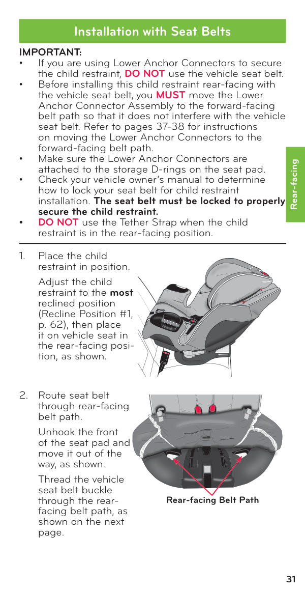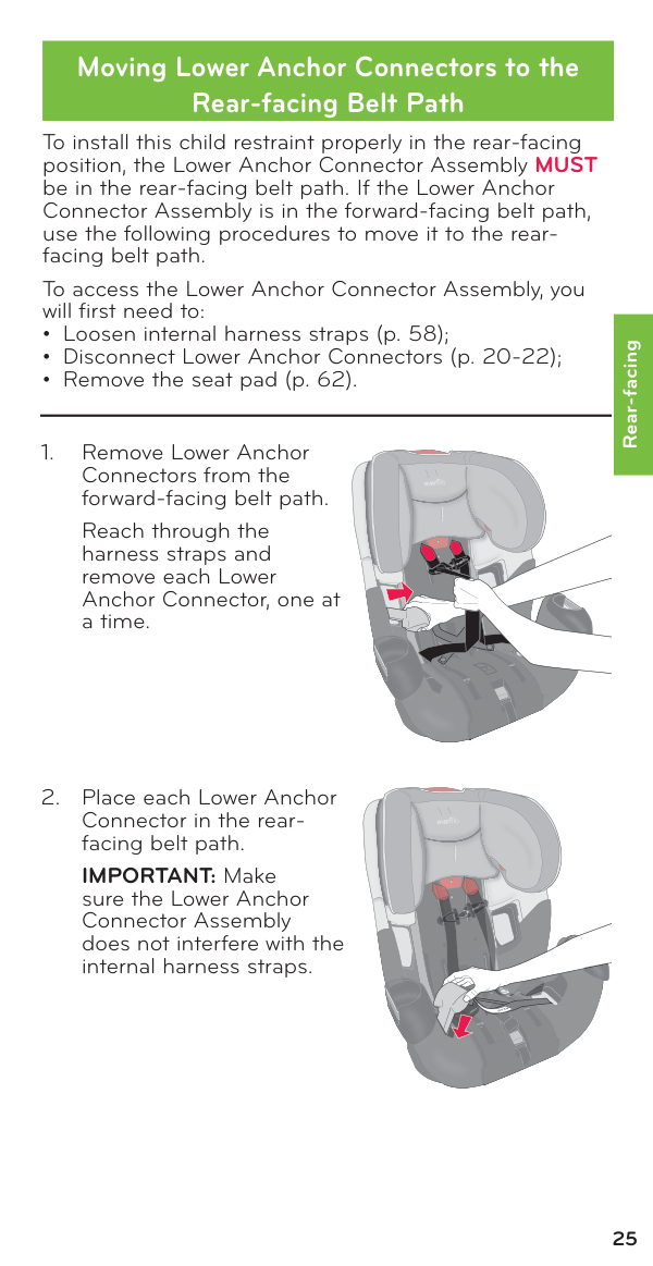 25 Rear-facing To install this child restraint properly in the rear-facing position, the Lower Anchor Connector Assembly MUST be in the rear-facing belt path. If the Lower Anchor Connector Assembly is in the forward-facing belt path, use the following procedures to move it to the rear- facing belt path. To access the Lower Anchor Connector Assembly, you will first need to: