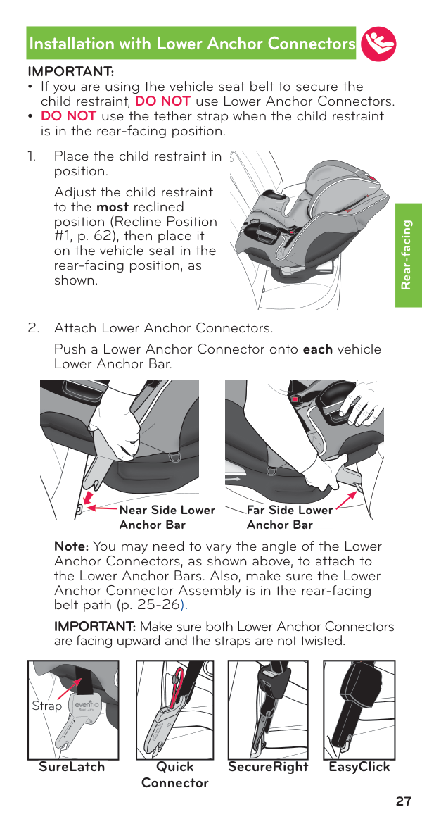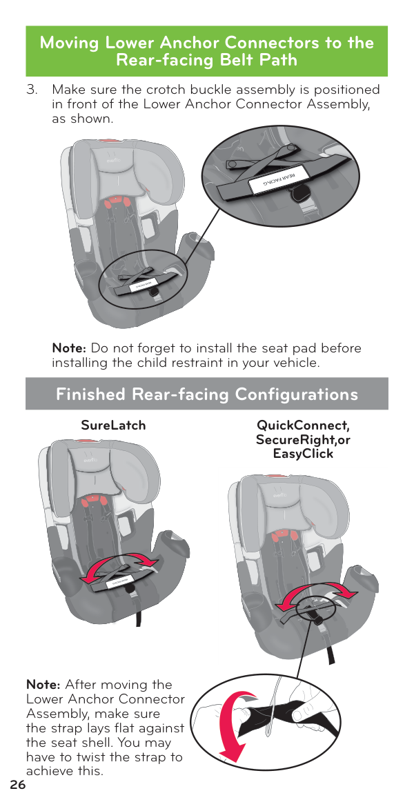 26 SureLatch Note: After moving the Lower Anchor Connector Assembly, make sure the strap lays flat against the seat shell. You may have to twist the strap to achieve this. Finished Rear-facing Configurations