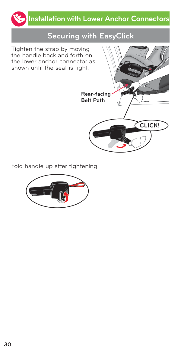 30 Installation with Lower Anchor Connectors Securing with EasyClick Tighten the strap by moving the handle back and forth on the lower anchor connector as shown until the seat is tight. this side