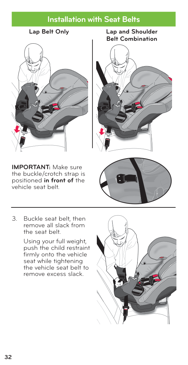• If you are using Lower Anchor Connectors to secure the child restraint, DO NOT use the vehicle seat belt. • Before installing this child restraint rear-facing with the vehicle seat belt, you MUST move the Lower Anchor Connector Assembly to the forward-facing belt path so that it does not interfere with the vehicle seat belt. Refer to pages 37-38 for instructions on moving the Lower Anchor Connectors to the forward-facing belt path. • Make sure the Lower Anchor Connectors are attached to the storage D-rings on the seat pad. • Check your vehicle owner’s manual to determine how to lock your seat belt for child restraint installation. The seat belt must be locked to properly secure the child restraint. • DO NOT use the Tether Strap when the child restraint is in the rear-facing position. Rear-facing Belt Path Installation with Seat Belts32 buckle storage buckle storage Lap Belt Only Lap and Shoulder Belt Combination buckle storage IMPORTANT: Make sure the buckle/crotch strap is positioned in front of the vehicle seat belt. Installation with Seat Belts