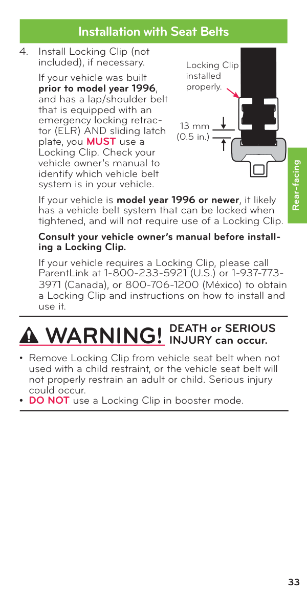 DEATH or SERIOUS INJURY can occur. Rear-facing ONLY Warnings Forward-facing with Harness and Belt-Positioning Booster Warnings10