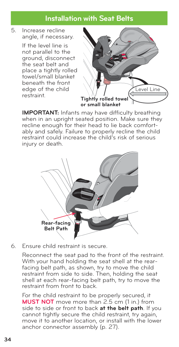 DEATH or SERIOUS INJURY can occur.34 buckle storage Rear-facing Belt Path Installation with Seat Belts buckle storage Tightly rolled towel or small blanket Level Line