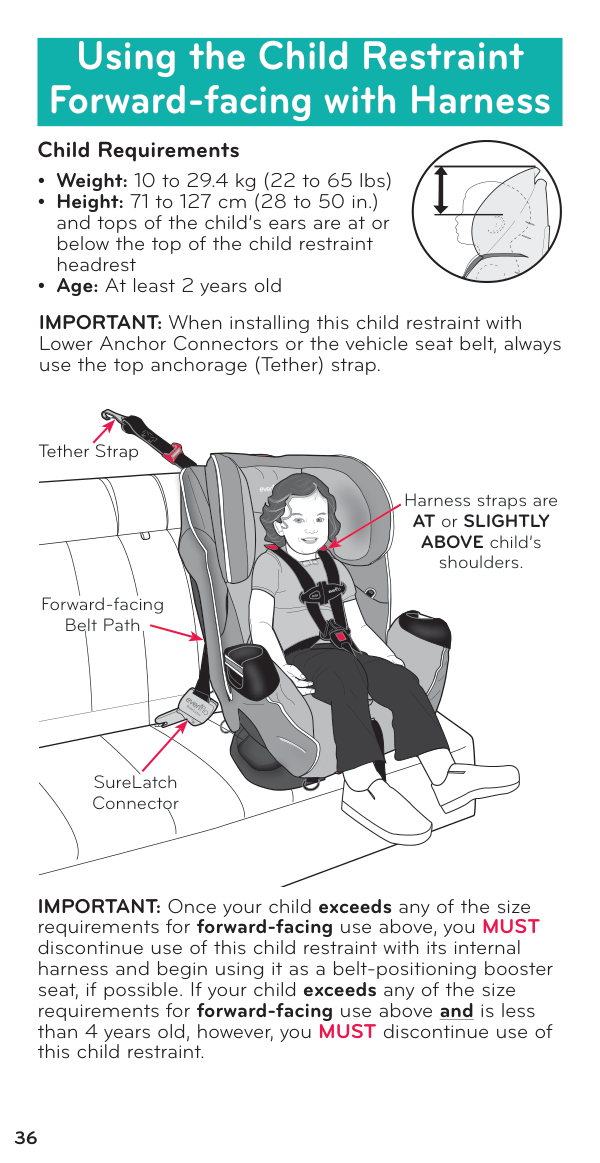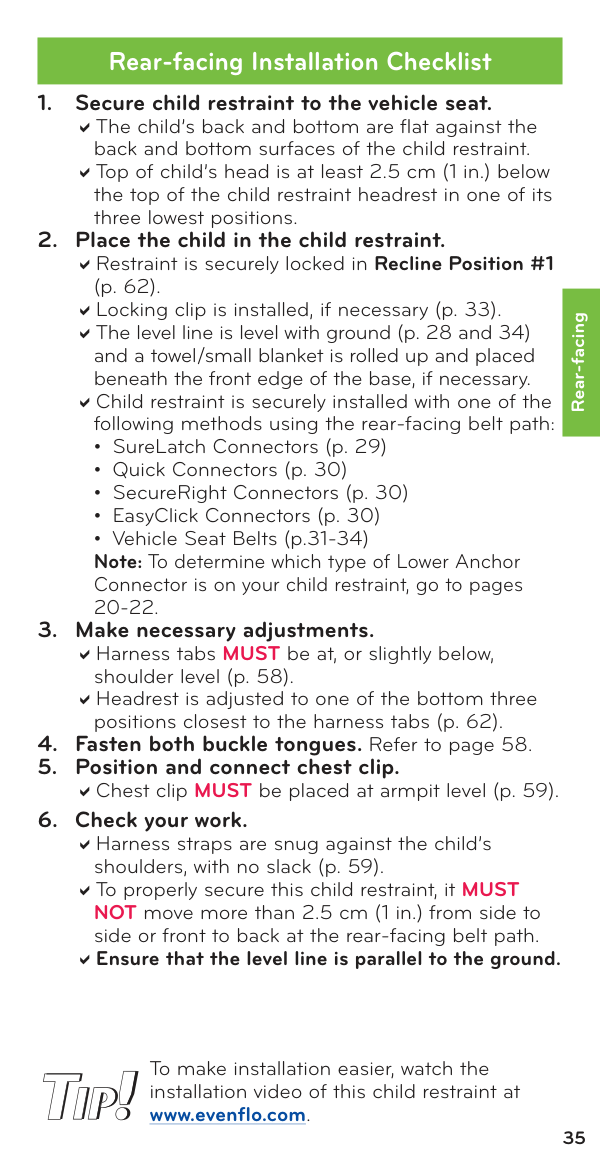 To make installation easier, watch the installation video of this child restraint at www.evenflo.com. Rear-facing Installation Checklist36 buckle storage Tether Strap SureLatch Connector Forward-facing Belt Path Harness straps are AT or SLIGHTLY ABOVE child’s shoulders. IMPORTANT: When installing this child restraint with Lower Anchor Connectors or the vehicle seat belt, always use the top anchorage (Tether) strap. Child Requirements