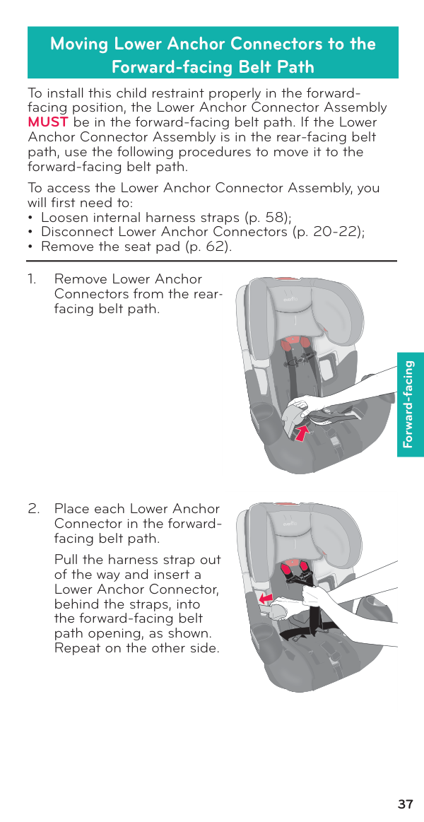 37 Forward-facing To install this child restraint properly in the forward- facing position, the Lower Anchor Connector Assembly MUST be in the forward-facing belt path. If the Lower Anchor Connector Assembly is in the rear-facing belt path, use the following procedures to move it to the forward-facing belt path. To access the Lower Anchor Connector Assembly, you will first need to: