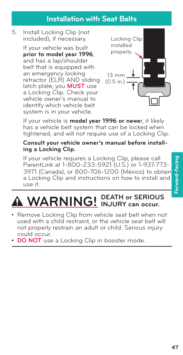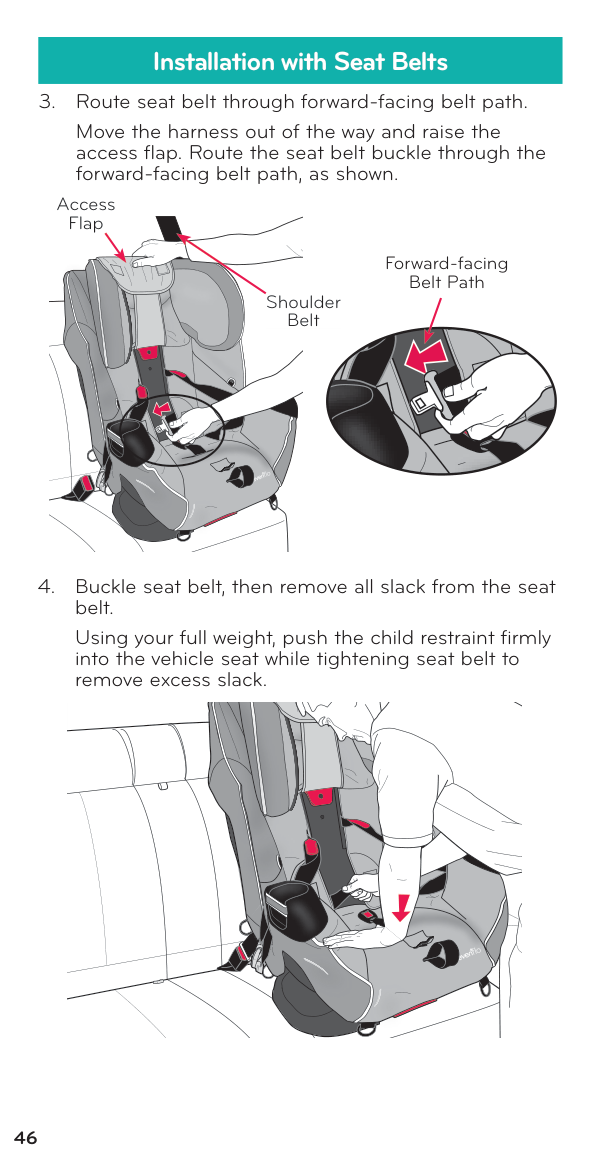 DEATH or SERIOUS INJURY can occur.48 buckle storage Forward-facing Belt Path Installation with Seat Belts