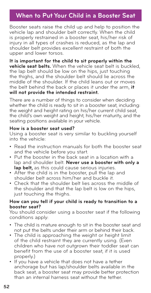 52 Booster seats raise the child up and help to position the vehicle lap and shoulder belt correctly. When the child is properly restrained in a booster seat, his/her risk of injury in all types of crashes is reduced, as the lap and shoulder belt provides excellent restraint of both the upper and lower torsos. It is important for the child to sit properly within the vehicle seat belts. When the vehicle seat belt is buckled, the lap belt should be low on the hips, just touching the thighs, and the shoulder belt should lie across the middle of the shoulder. If the child leans out or moves the belt behind the back or places it under the arm, it will not provide the intended restraint. There are a number of things to consider when deciding whether the child is ready to sit in a booster seat, including: the weight and height rating on his/her current child seat, the child’s own weight and height, his/her maturity, and the seating positions available in your vehicle. How is a booster seat used? Using a booster seat is very similar to buckling yourself into the vehicle: