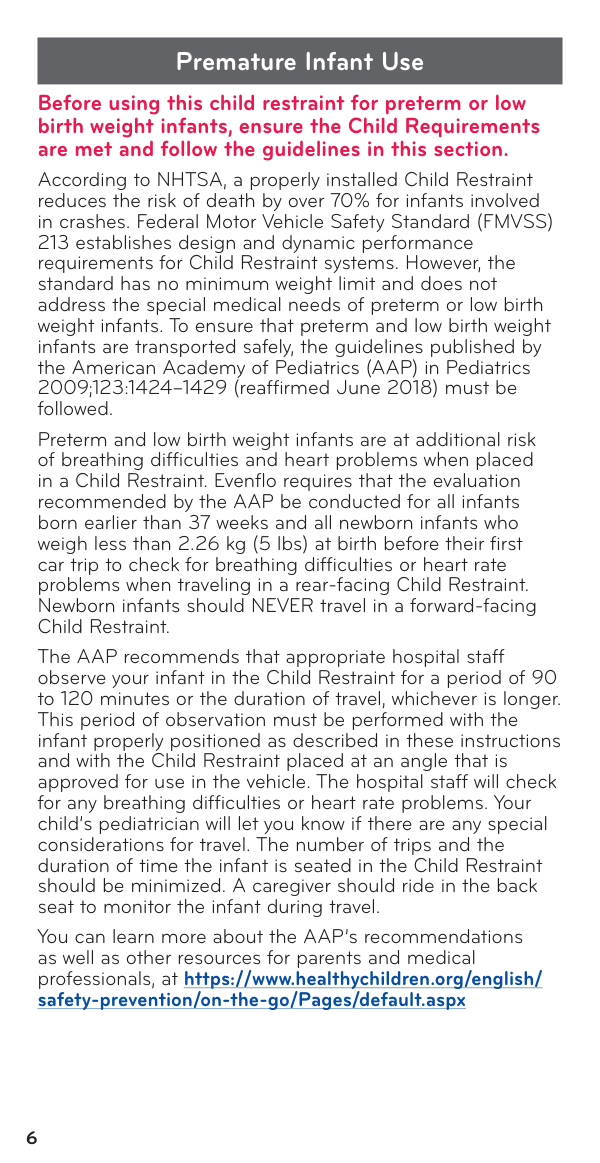 6 Before using this child restraint for preterm or low birth weight infants, ensure the Child Requirements are met and follow the guidelines in this section. According to NHTSA, a properly installed Child Restraint reduces the risk of death by over 70% for infants involved in crashes. Federal Motor Vehicle Safety Standard (FMVSS) 213 establishes design and dynamic performance requirements for Child Restraint systems. However, the standard has no minimum weight limit and does not address the special medical needs of preterm or low birth weight infants. To ensure that preterm and low birth weight infants are transported safely, the guidelines published by the American Academy of Pediatrics (AAP) in Pediatrics 2009;123:1424–1429 (reaffirmed June 2018) must be followed. Preterm and low birth weight infants are at additional risk of breathing difficulties and heart problems when placed in a Child Restraint. Evenflo requires that the evaluation recommended by the AAP be conducted for all infants born earlier than 37 weeks and all newborn infants who weigh less than 2.26 kg (5 lbs) at birth before their first car trip to check for breathing difficulties or heart rate problems when traveling in a rear-facing Child Restraint. Newborn infants should NEVER travel in a forward-facing Child Restraint. The AAP recommends that appropriate hospital staff observe your infant in the Child Restraint for a period of 90 to 120 minutes or the duration of travel, whichever is longer. This period of observation must be performed with the infant properly positioned as described in these instructions and with the Child Restraint placed at an angle that is approved for use in the vehicle. The hospital staff will check for any breathing difficulties or heart rate problems. Your child’s pediatrician will let you know if there are any special considerations for travel. The number of trips and the duration of time the infant is seated in the Child Restraint should be minimized. A caregiver should ride in the back seat to monitor the infant during travel. You can learn more about the AAP’s recommendations as well as other resources for parents and medical professionals, at https://www.healthychildren.org/english/ safety-prevention/on-the-go/Pages/default.aspx Premature Infant Use
