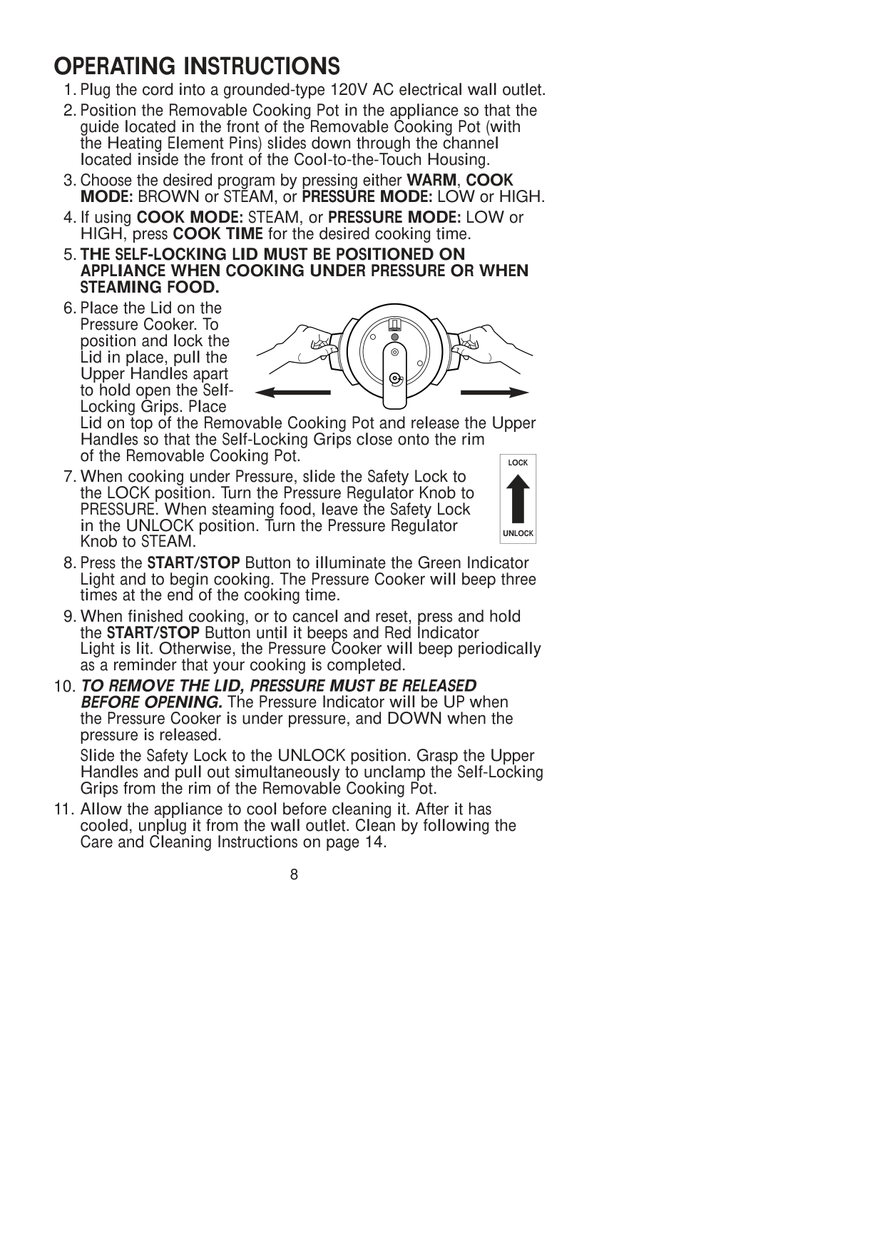 BEFORE OPENING. The Pressure Indicator will be UP when the Pressure Cooker is under pressure, and DOWN when the pressure is released. Slide the Safety Lock to the UNLOCK position. Grasp the Upper Handles and pull out simultaneously to unclamp the Self-Locking Grips from the rim of the Removable Cooking Pot.Lock