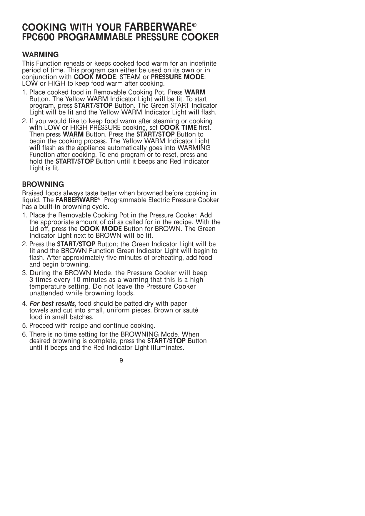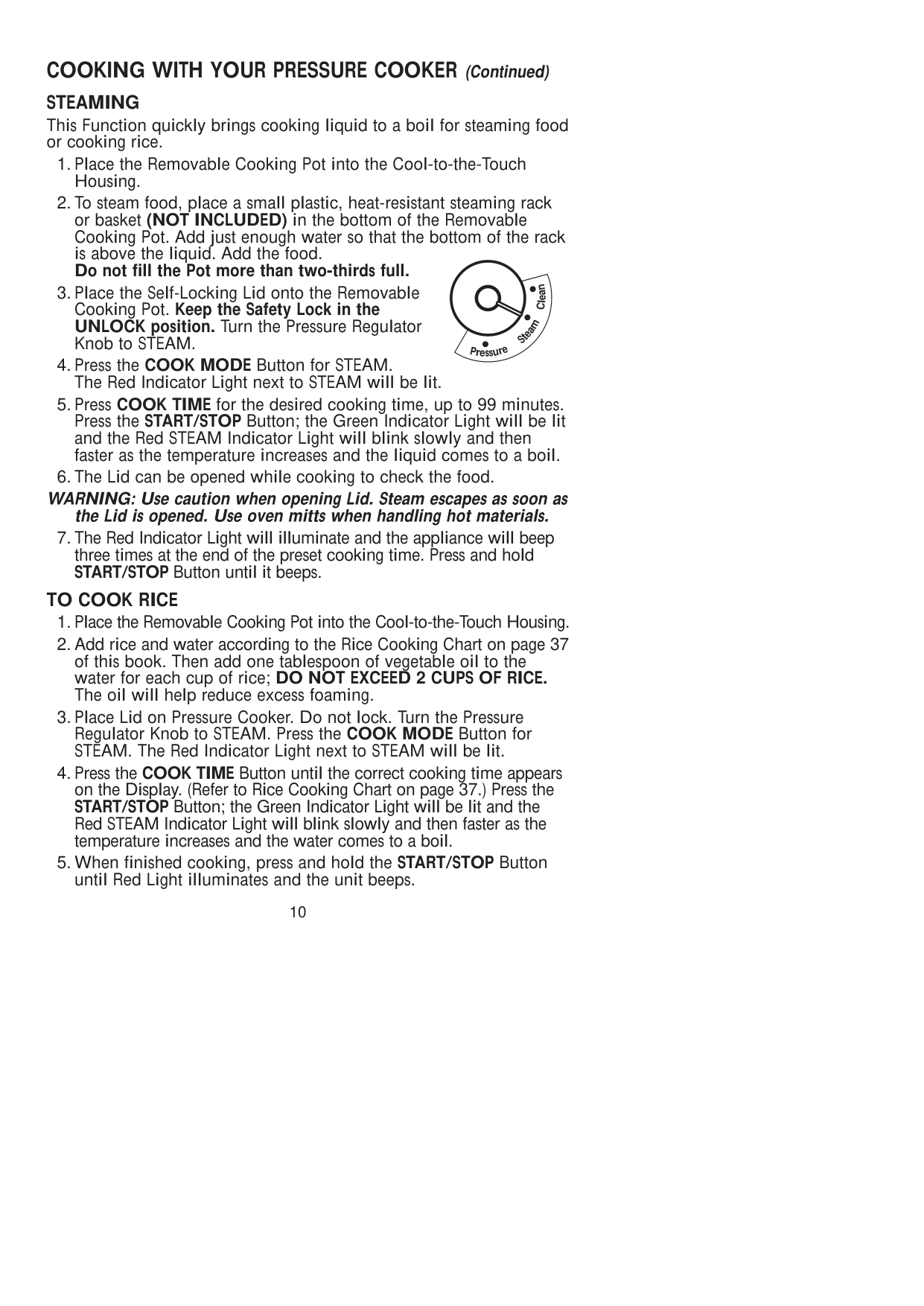 BROWN or STEAM: For BROWN Function, press COOK MODE Button until the Green Indicator Light next to BROWN is lit. Press the START/STOP Button until the Green Indicator Light illuminates. The Clock will display: "--" indicating that the Cooker is in BROWN Mode and the appliance will begin to heat immediately and will remain hot until START/STOP Button is pressed again to end the BROWN Function. For STEAM Function and to bring water to a boil, press COOK MODE Button until Red Indicator Light next to STEAM is lit. Press COOK TIME Button to enter the cooking time desired and then press the START/STOP Button. The unit will begin to count down in minutes, and will beep 3 times when finished.Pressure Mode