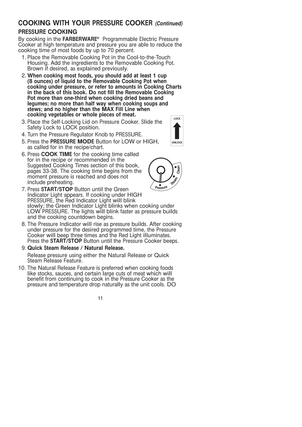 LOW or HIGH: For cooking food under LOW PRESSURE, press PRESSURE MODE Button until Green Indicator Light is lit; for HIGH PRESSURE, press until Red Indicator Light is lit. Press COOK TIME Button for the cooking time desired and then press the START/STOP Button. The Unit will begin to count down in minutes, and will beep 3 times when finished. Let pressure drop on its own by using the Natural Release Feature, or release immediately by pressing the Quick Steam Release Button in short bursts until pressure is reduced. DO NOT hold this Button down, as hot liquid may be ejected. To cancel or stop cooking before time has elapsed, press and hold the START/STOP Button until the Red Light illuminates and the Pressure Cooker beeps.Programmable