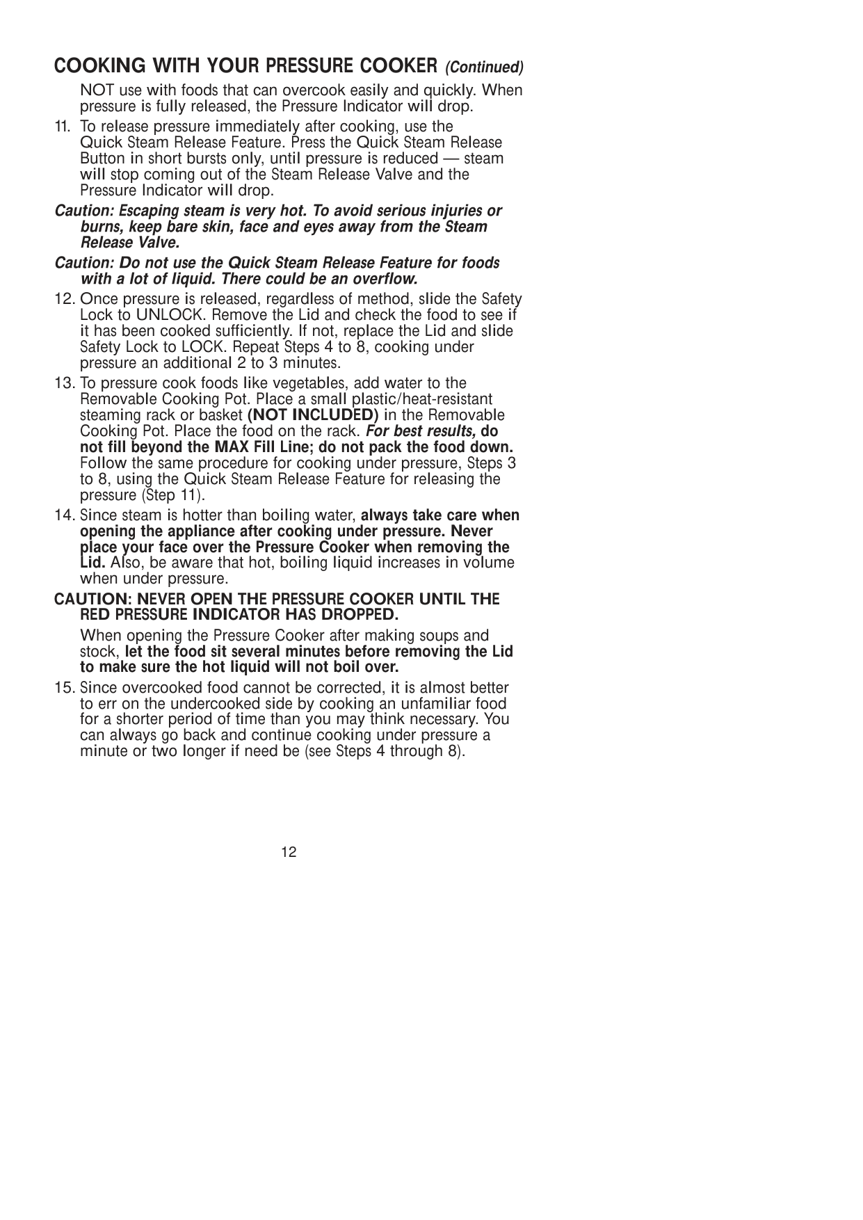 12 NOT use with foods that can overcook easily and quickly. When pressure is fully released, the Pressure Indicator will drop.