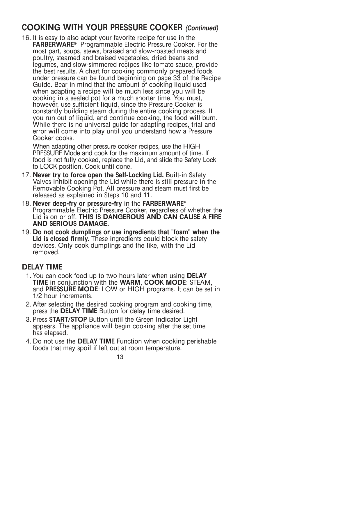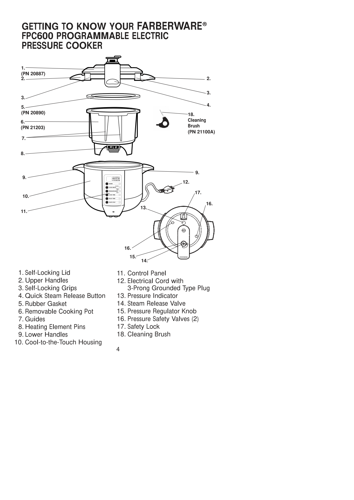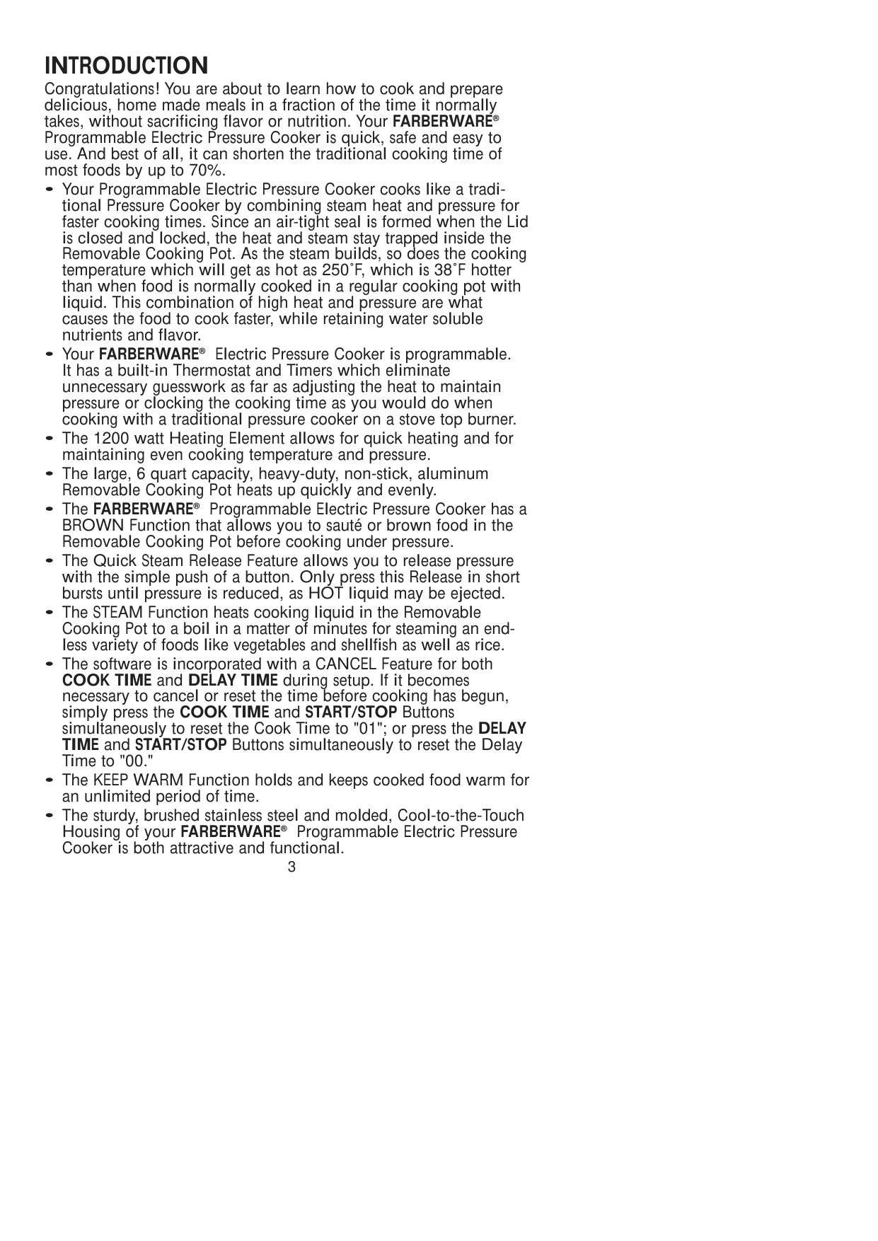 Congratulations! You are about to learn how to cook and prepare delicious, home made meals in a fraction of the time it normally takes, without sacrificing flavor or nutrition. Your FARBERWARE® Programmable Electric Pressure Cooker is quick, safe and easy to use. And best of all, it can shorten the traditional cooking time of most foods by up to 70%.4