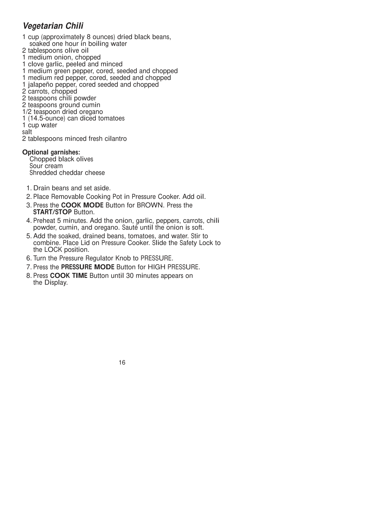 The following recipes have been especially developed for preparing in the FARBERWARE® Programmable Pressure Cooker by leading housewares expert and best-selling cookbook author, Tom Lacalamita, The Kitchen Resource. A listing of suggested cooking times follows for your convenience. Baked Beans in a Pot 3 (15-oz.) cans small white beans, drained and rinsed under cold water in a colander 2 tablespoons olive oil 1 small red onion, chopped 1 clove garlic, peeled and minced 1 small rib celery, chopped 1 small carrot, chopped 1 bay leaf 3 tablespoons molasses 3 tablespoons packed brown sugar 1-1/2 teaspoons dry mustard 1/2 teaspoon dried thyme16 Vegetarian Chili 1 cup (approximately 8 ounces) dried black beans, soaked one hour in boiling water 2 tablespoons olive oil 1 medium onion, chopped 1 clove garlic, peeled and minced 1 medium green pepper, cored, seeded and chopped 1 medium red pepper, cored, seeded and chopped 1 jalapeño pepper, cored seeded and chopped 2 carrots, chopped 2 teaspoons chili powder 2 teaspoons ground cumin 1/2 teaspoon dried oregano 1 (14.5-ounce) can diced tomatoes 1 cup water salt 2 tablespoons minced fresh cilantro Optional garnishes: Chopped black olives Sour cream Shredded cheddar cheese