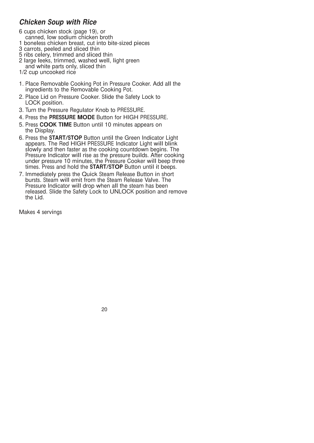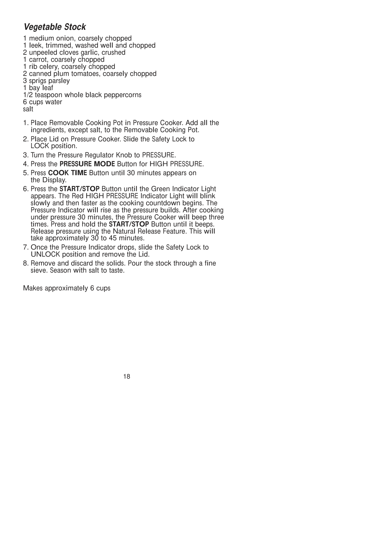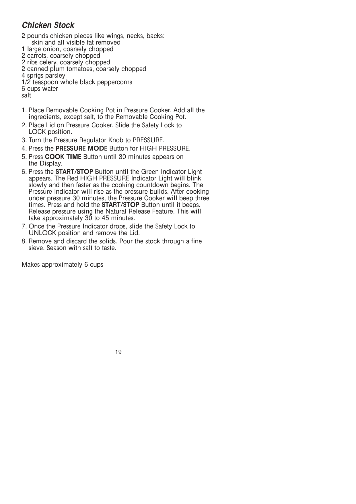 When opening the Pressure Cooker after making soups and stock, let the food sit several minutes before removing the Lid to make sure the hot liquid will not boil over.13