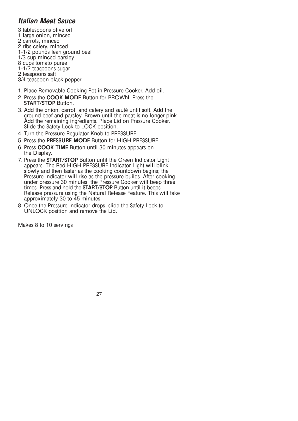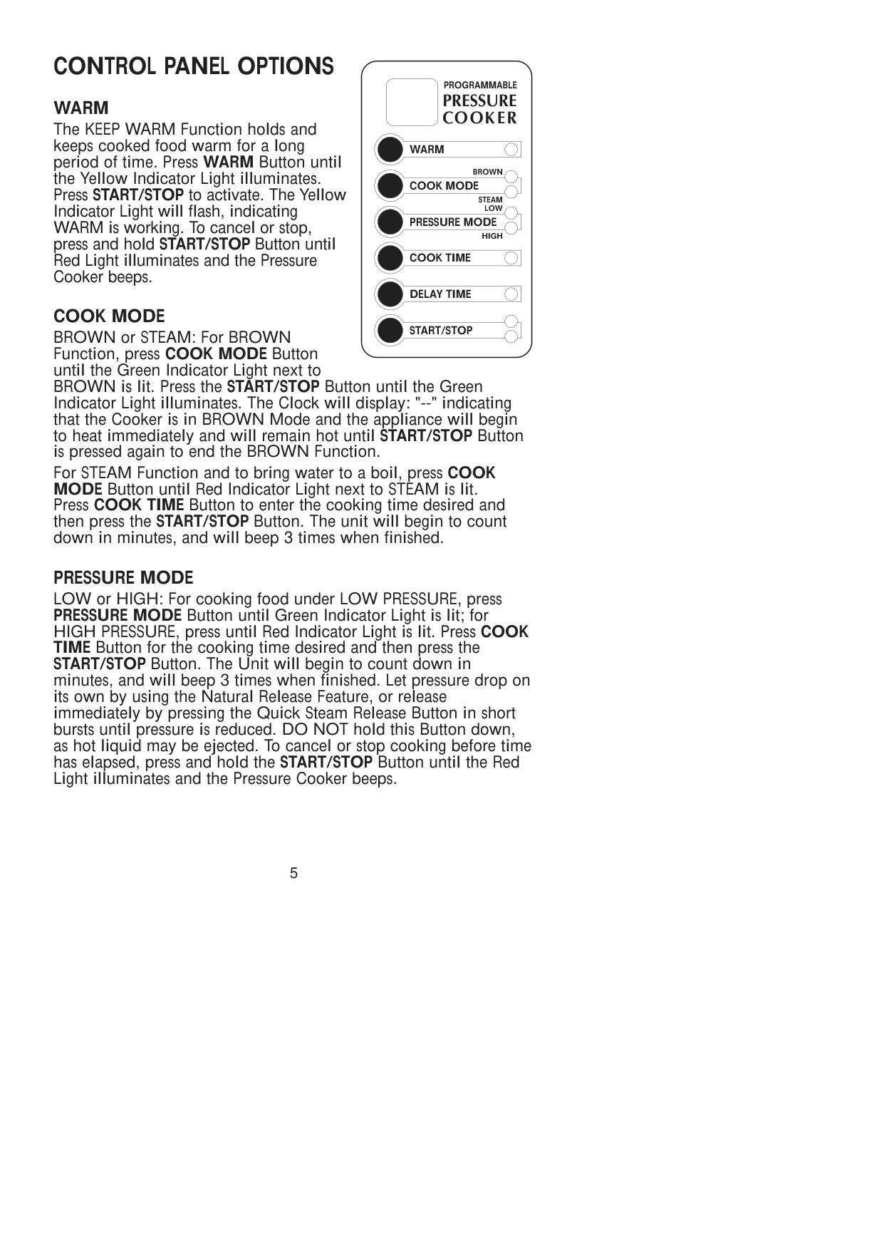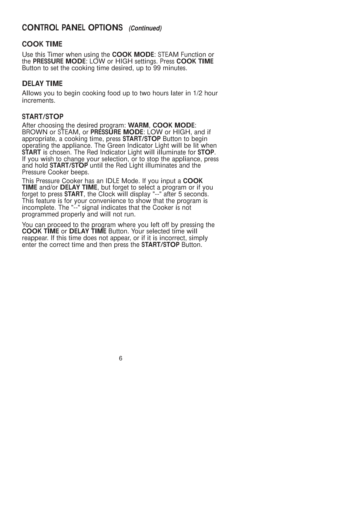 After choosing the desired program: WARM, COOK MODE: BROWN or STEAM, or PRESSURE MODE: LOW or HIGH, and if appropriate, a cooking time, press START/STOP Button to begin operating the appliance. The Green Indicator Light will be lit when START is chosen. The Red Indicator Light will illuminate for STOP. If you wish to change your selection, or to stop the appliance, press and hold START/STOP until the Red Light illuminates and the Pressure Cooker beeps. This Pressure Cooker has an IDLE Mode. If you input a COOK TIME and/or DELAY TIME, but forget to select a program or if you forget to press START, the Clock will display "--" after 5 seconds. This feature is for your convenience to show that the program is incomplete. The "--" signal indicates that the Cooker is not programmed properly and will not run. You can proceed to the program where you left off by pressing the COOK TIME or DELAY TIME Button. Your selected time will reappear. If this time does not appear, or if it is incorrect, simply enter the correct time and then press the START/STOP Button. CONTROL PANEL OPTIONS (Continued)7