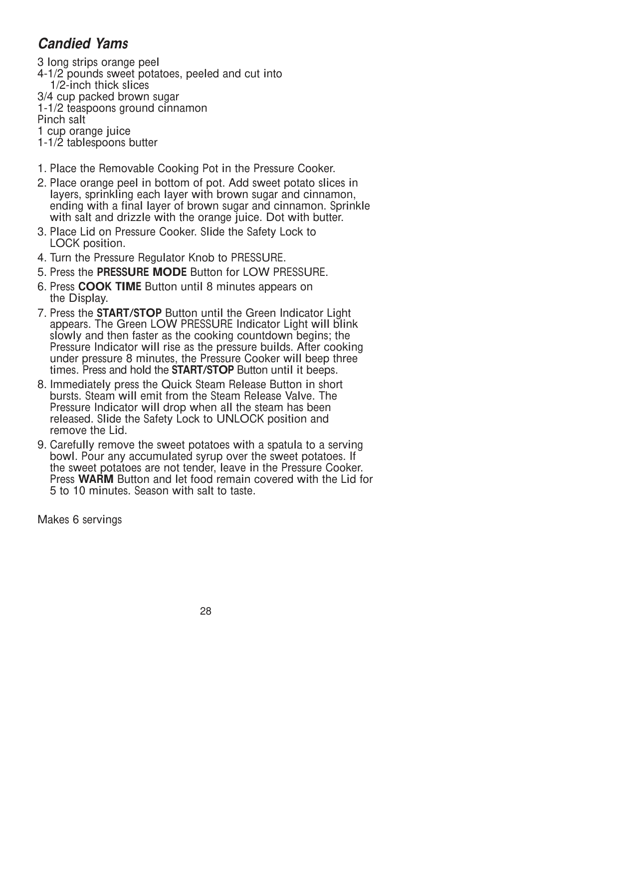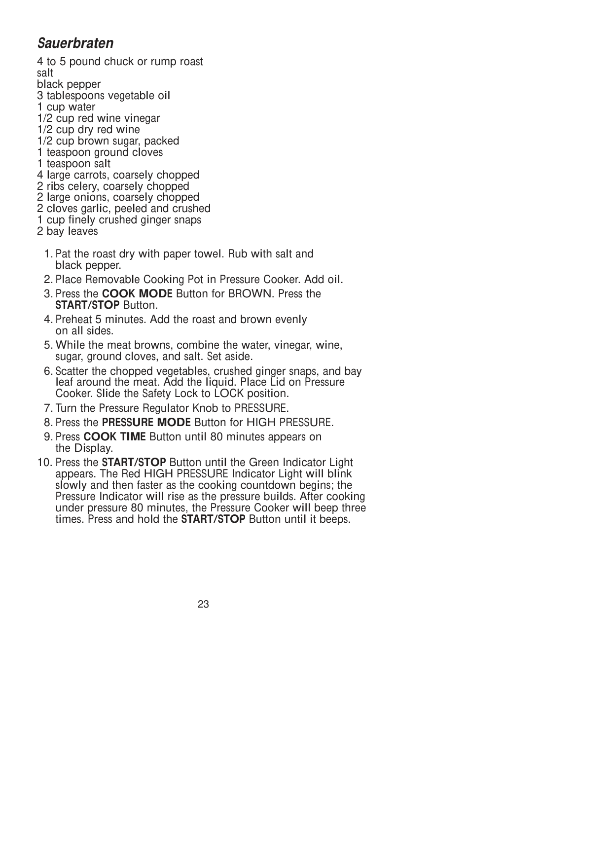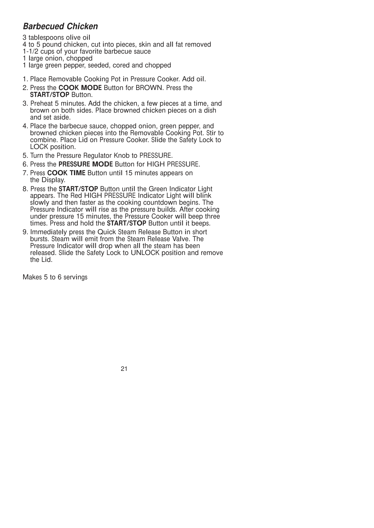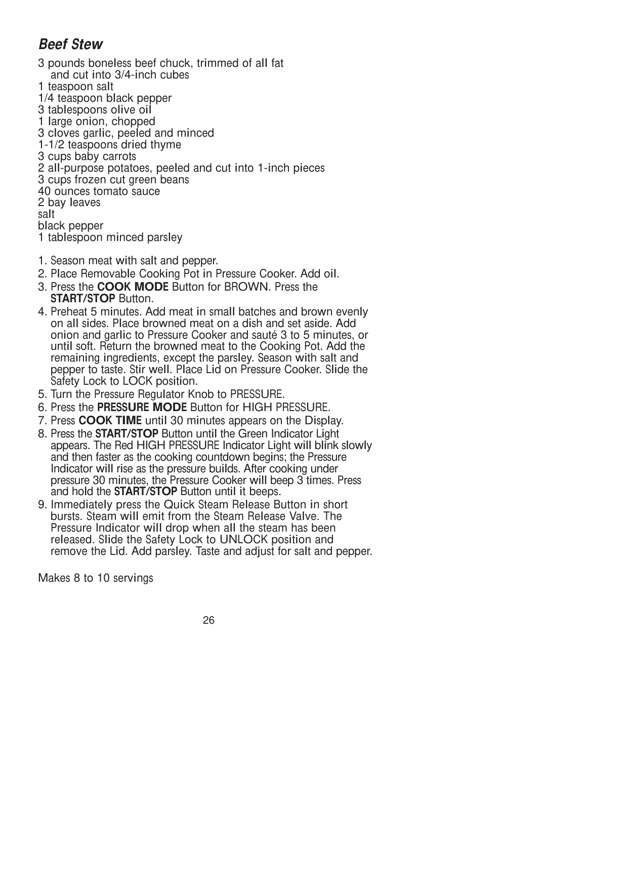 After choosing the desired program: WARM, COOK MODE: BROWN or STEAM, or PRESSURE MODE: LOW or HIGH, and if appropriate, a cooking time, press START/STOP Button to begin operating the appliance. The Green Indicator Light will be lit when START is chosen. The Red Indicator Light will illuminate for STOP. If you wish to change your selection, or to stop the appliance, press and hold START/STOP until the Red Light illuminates and the Pressure Cooker beeps. This Pressure Cooker has an IDLE Mode. If you input a COOK TIME and/or DELAY TIME, but forget to select a program or if you forget to press START, the Clock will display "--" after 5 seconds. This feature is for your convenience to show that the program is incomplete. The "--" signal indicates that the Cooker is not programmed properly and will not run. You can proceed to the program where you left off by pressing the COOK TIME or DELAY TIME Button. Your selected time will reappear. If this time does not appear, or if it is incorrect, simply enter the correct time and then press the START/STOP Button. CONTROL PANEL OPTIONS (Continued)7