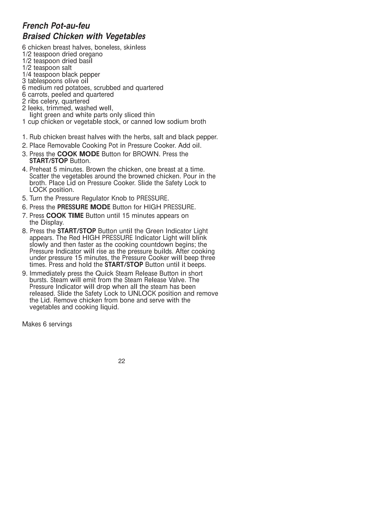 22 French Pot-au-feu Braised Chicken with Vegetables 6 chicken breast halves, boneless, skinless 1/2 teaspoon dried oregano 1/2 teaspoon dried basil 1/2 teaspoon salt 1/4 teaspoon black pepper 3 tablespoons olive oil 6 medium red potatoes, scrubbed and quartered 6 carrots, peeled and quartered 2 ribs celery, quartered 2 leeks, trimmed, washed well, light green and white parts only sliced thin 1 cup chicken or vegetable stock, or canned low sodium broth