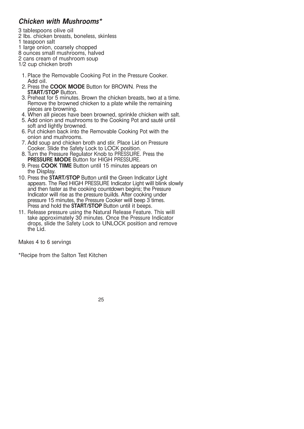 25 Chicken with Mushrooms* 3 tablespoons olive oil 2 lbs. chicken breasts, boneless, skinless 1 teaspoon salt 1 large onion, coarsely chopped 8 ounces small mushrooms, halved 2 cans cream of mushroom soup 1/2 cup chicken broth