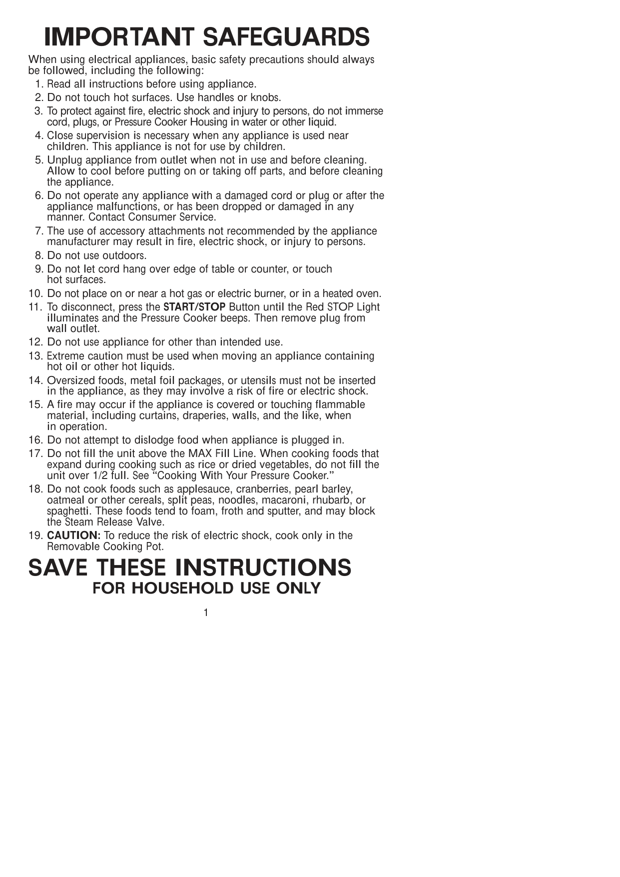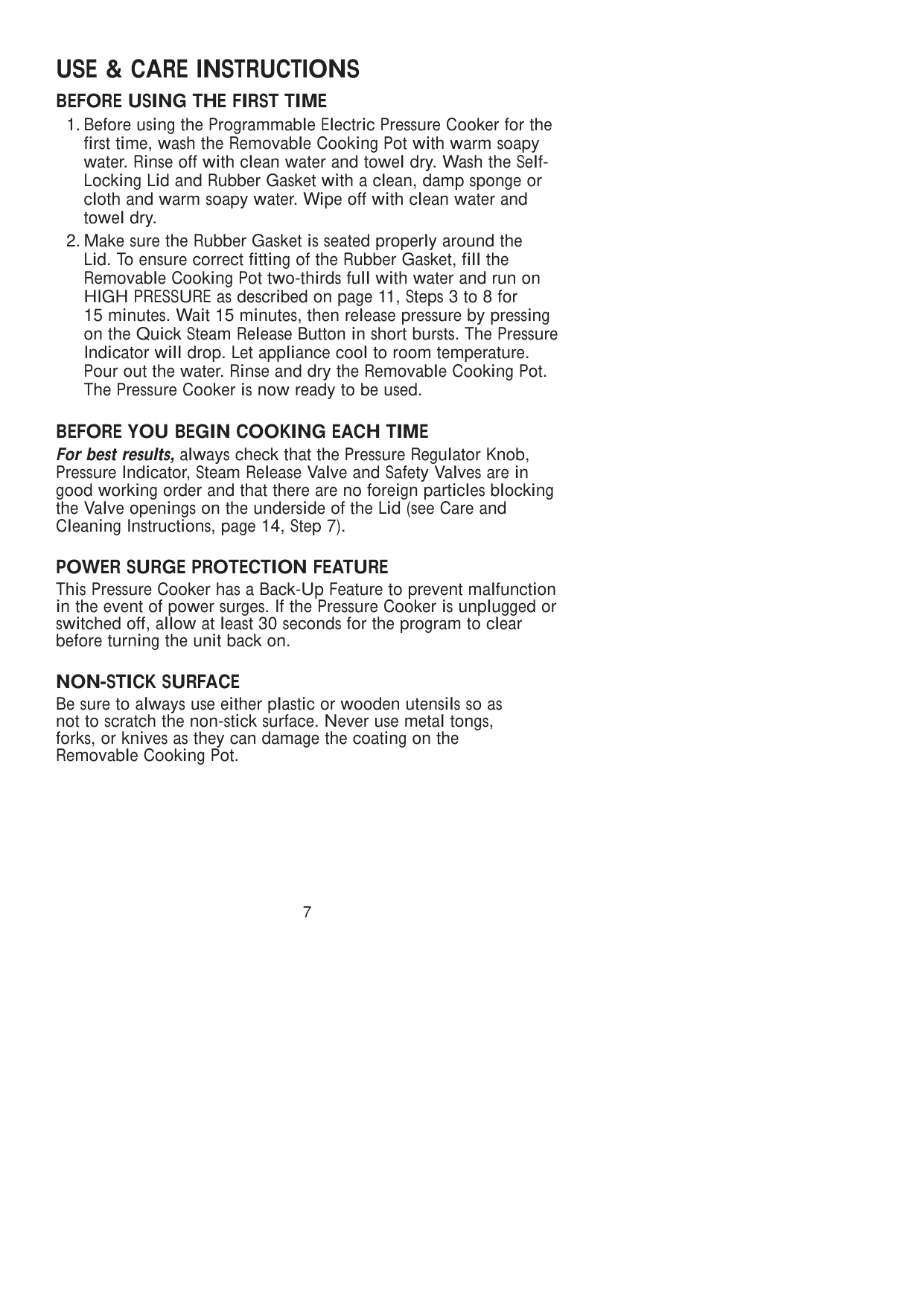 For best results, always check that the Pressure Regulator Knob, Pressure Indicator, Steam Release Valve and Safety Valves are in good working order and that there are no foreign particles blocking the Valve openings on the underside of the Lid (see Care and Cleaning Instructions, page 14, Step 7).Power Surge Protection Feature