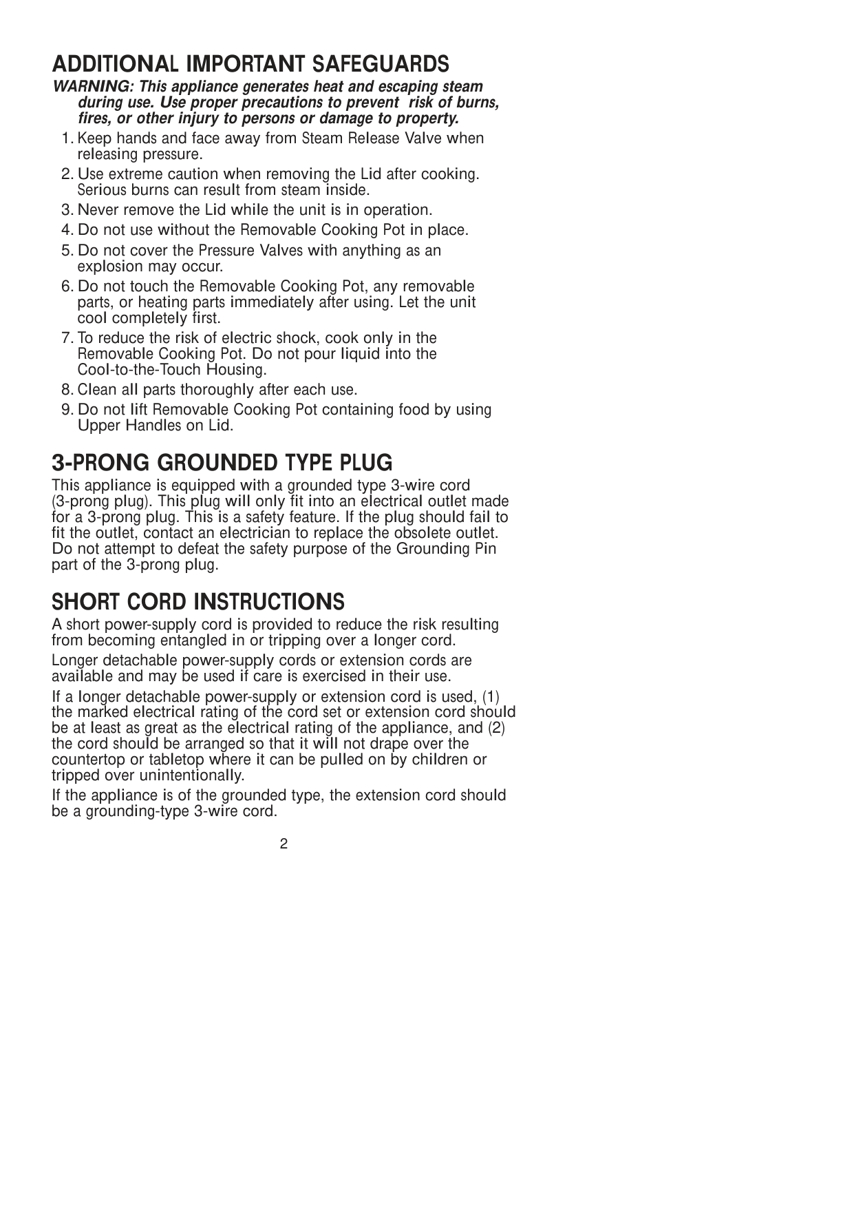 WARNING: This appliance generates heat and escaping steam during use. Use proper precautions to prevent risk of burns, fires, or other injury to persons or damage to property.3-Prong Grounded Type Plug